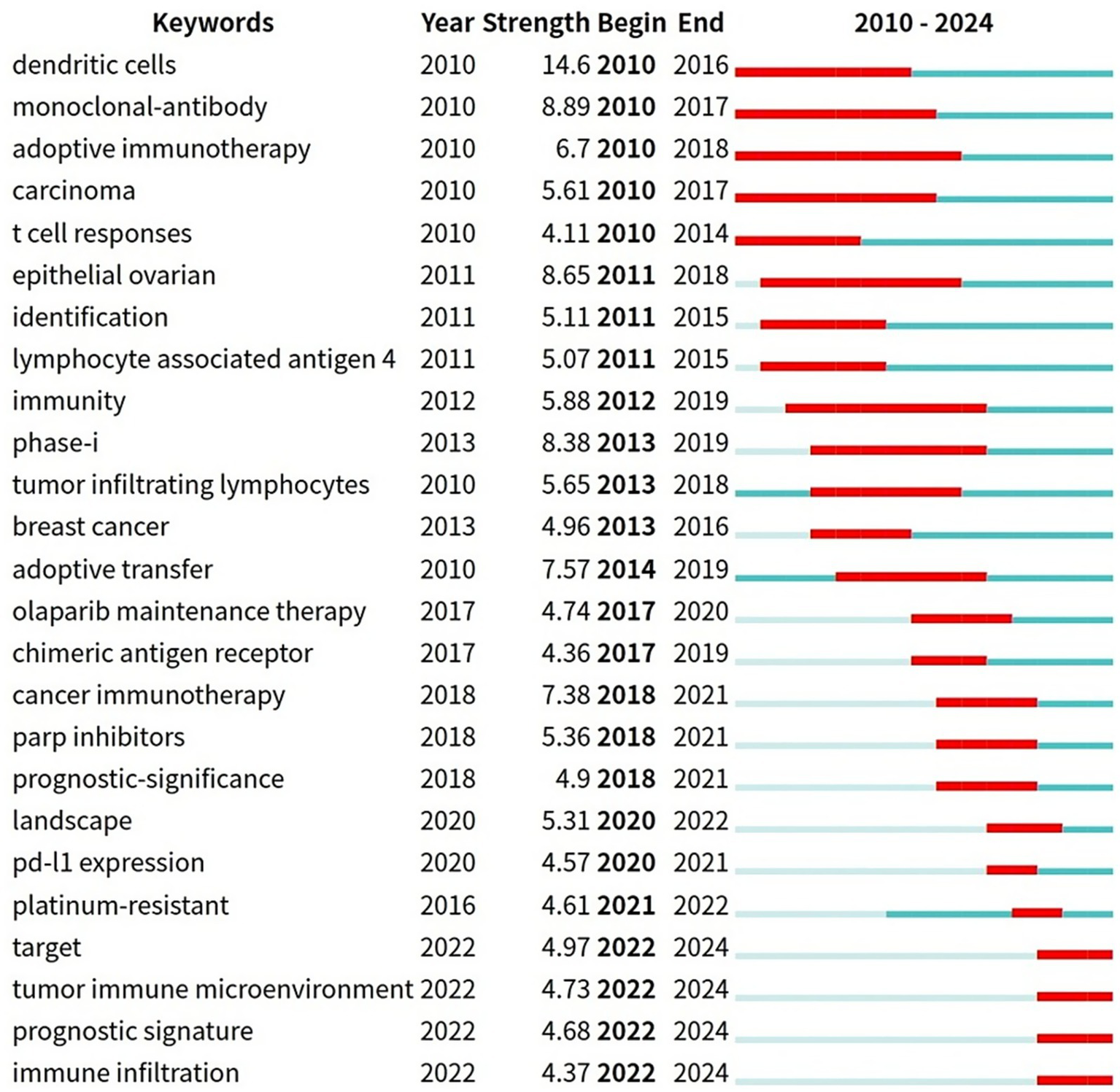 Figure 9 presents the top 25 keywords with the highest citation burst rates. Over time, keywords “adoptive immunotherapy” resistance, with a burst duration from 2010 to 2018, spanning 7 years, “monoclonal-antibody” (2010–2017, 7 years), “carcinoma” (2010–2017, 7 years), “epithelial ovarian” (2011–2018, 7 years), and “immunity” (2012–2019, 7 years) have consistently garnered significant attention. Additionally, terms like “target” (2022–2024), “tumor immune microenvironment” (2022–2024), and “immune infiltration” (2022–2024) have recently gained prominence, highlighting them as key areas of active research, in the past few years and for the near future.