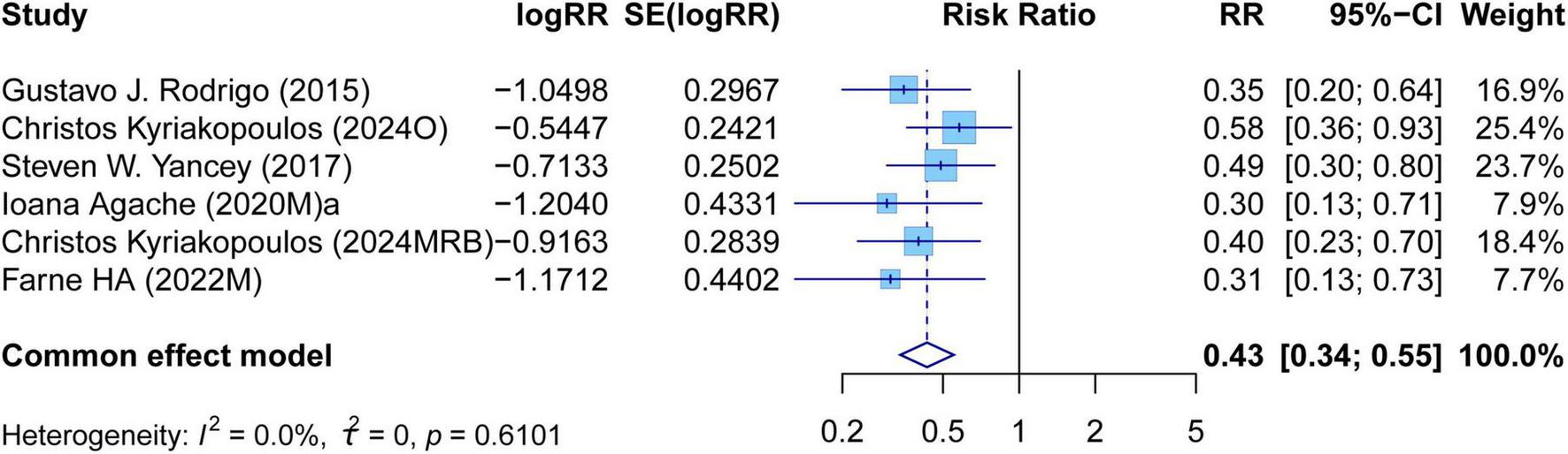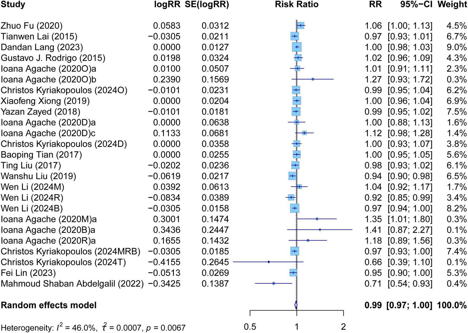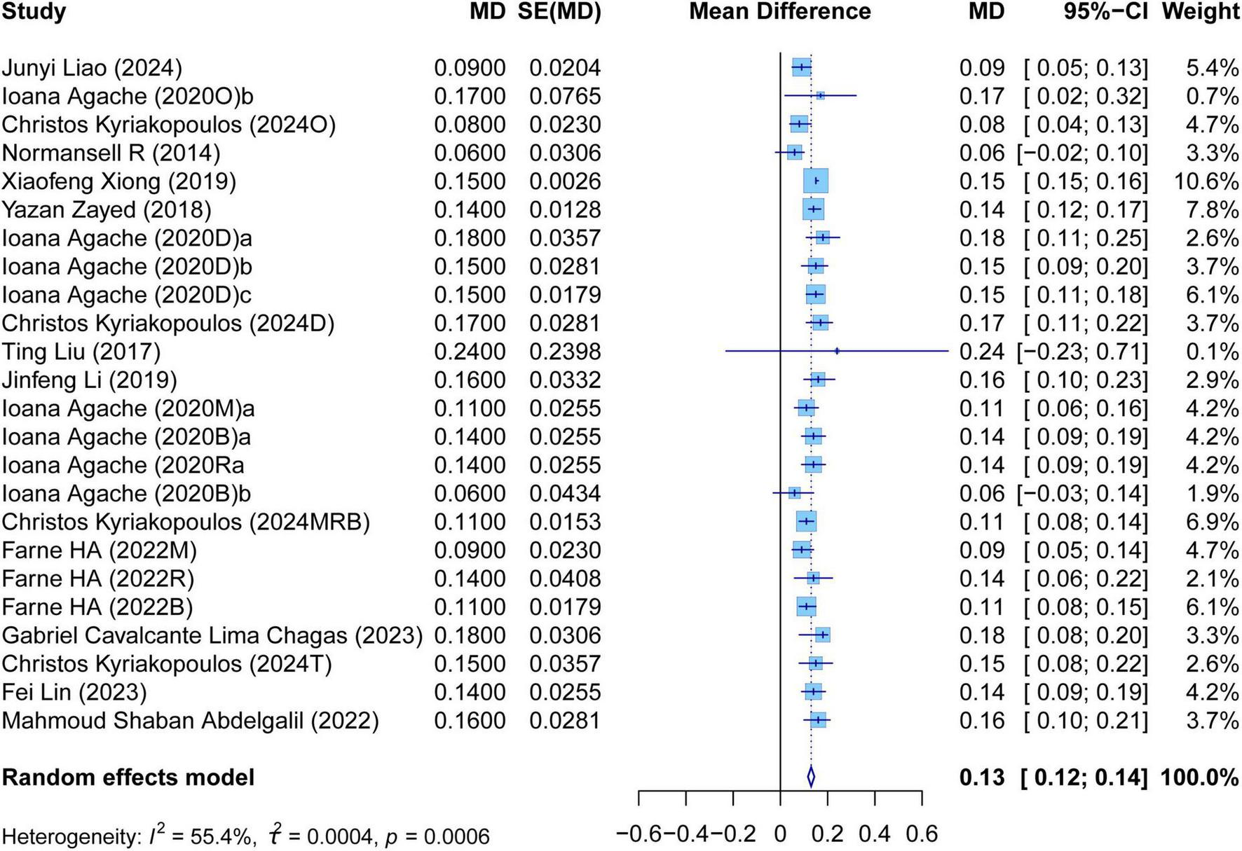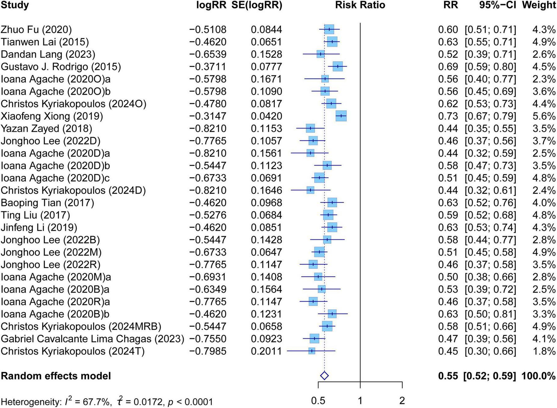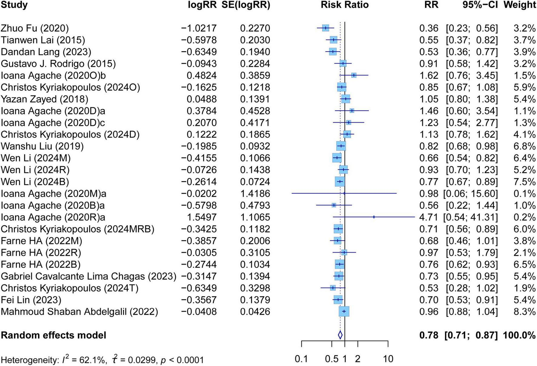The meta-analysis evaluated the efficacy and safety of anti-IgE group compared with the control group across various outcomes, such as AER, asthma-related hospitalizations, FEV1, ACQ scores, AQLQ scores, AEs, and SAEs. In terms of efficacy, the anti-IgE group was associated with a significant reduction in AER (RR: 0.62, 95% CI: 0.58–0.66, P < 0.0001, I2 = 0%) (Supplementary Figure S1A). It also significantly lowered asthma-related hospitalizations in the anti-IgE group (RR: 0.47, 95% CI: 0.33–0.68, P < 0.0001, I2 = 42.5%) (Supplementary Figure S1B). Concerning lung function, FEV1 values showed a significant improvement in the anti-IgE group compared with the control group (MD: 0.08, 95% CI: 0.06–0.11, P < 0.0001, I2 = 0%) (Supplementary Figure S2A). Moreover, the assessment of PROs revealed that the anti-IgE group led to a significant decrease in ACQ scores (MD: −0.38, 95% CI: −0.64 to −0.12, P = 0.0037, I2 = 0%) (Supplementary Figure S2B) and a significant rise in AQLQ scores (MD: 0.32, 95% CI: 0.22–0.41, P < 0.0001, I2 = 39.1%) (Supplementary Figure S2C). In terms of safety, there was no significant difference in AEs between the two groups (RR: 1.00, 95% CI: 0.98–1.02, P = 0.8074, I2 = 29.5%) (Supplementary Figure S1C). Notably, fewer SAEs were observed in the anti-IgE group, with a statistically significant difference (RR: 0.68, 95% CI: 0.49–0.95, P = 0.0248, I2 = 75.7%) (Supplementary Figure S1D).