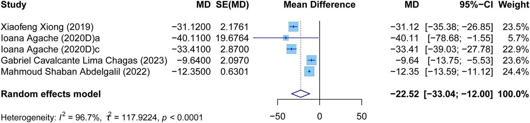 Figure 5. Forest plot of the mean change difference in asthma control questionnaire scores comparing biologics and controls.