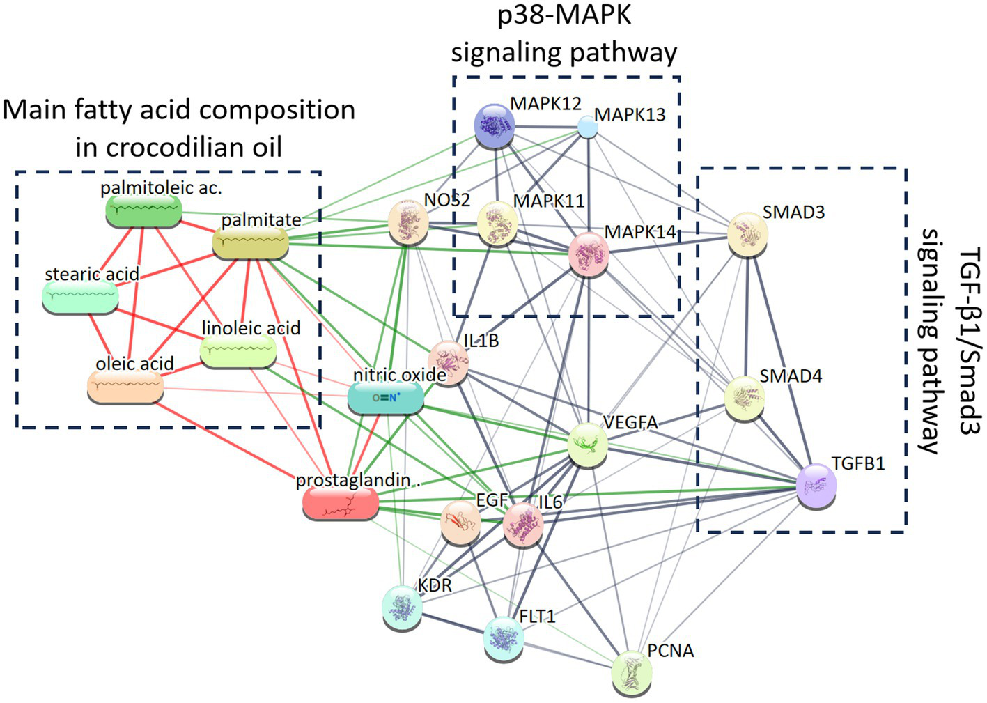 Interaction network of the five principal fatty acids in crocodilian oil with the p38 MAPK and TGF-β1/Smad3 signaling pathways, generated using STITCH v5.0. This figure illustrates the interaction network between key fatty acids in crocodilian oil (including palmitoleic acid, palmitic acid, stearic acid, oleic acid, and linoleic acid) and the p38 MAPK (MAPK12/13/11/14) and TGF-β1/Smad3 (TGFB1, SMAD3/4) signaling pathways, generated using the STITCH database. This study pioneers the systematic mapping of synergistic interactions between crocodilian oil components and growth factors, providing a multi-target framework for understanding their anti-inflammatory and pro-regenerative effects, and advancing the application of natural products in precision medicine.