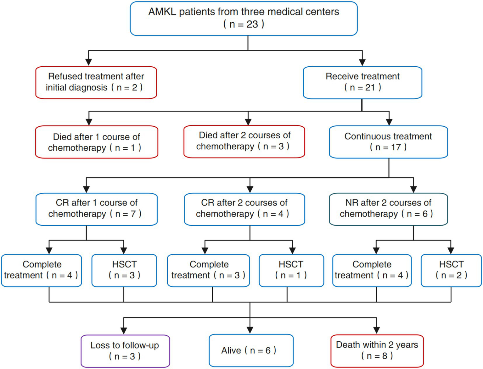 The clinical data of 23 patients with AMKL admitted to three large medical centers in southern China, namely the Fujian Medical University Union Hospital, the Affiliated Hospital of Putian University and the First Affiliated Hospital of Gannan Medical University from January 2014 to July 2024, were retrospectively analyzed. The diagnostic criteria for AMKL refer to the WHO classification diagnostic criteria (7–9), that is, bone marrow original cells ≥20%, of which ≥50% originated from the megakaryocytic lineage; and the original cells express CD41, CD42, CD61 or VII factors. The flow chart of the design and screening sources for this study is shown in Figure 1.