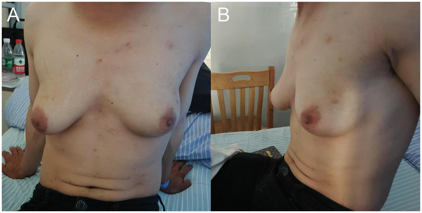 A 29-year-old male patient was diagnosed with HIV and subsequently initiated ART consisting of efavirenz (600 mg orally once daily), lamivudine (300 mg orally once daily), and tenofovir disoproxil fumarate (300 mg orally once daily). Two years into treatment, the patient developed gradual bilateral gynecomastia accompanied by mild breast pain, without nipple discharge or other discomfort. During this period, the patient did not seek medical advice for this condition, and the ART regimen remained unchanged. Six years after initiating ART, the patient’s breasts had enlarged to the extent that they were difficult to conceal with clothing, resembling female breasts, which led to feelings of inferiority, anxiety, and other emotional disturbances. The patient presented to our hospital’s breast surgery department, where a physical examination revealed severe bilateral gynecomastia, with the right side being larger than the left (Figure 1).