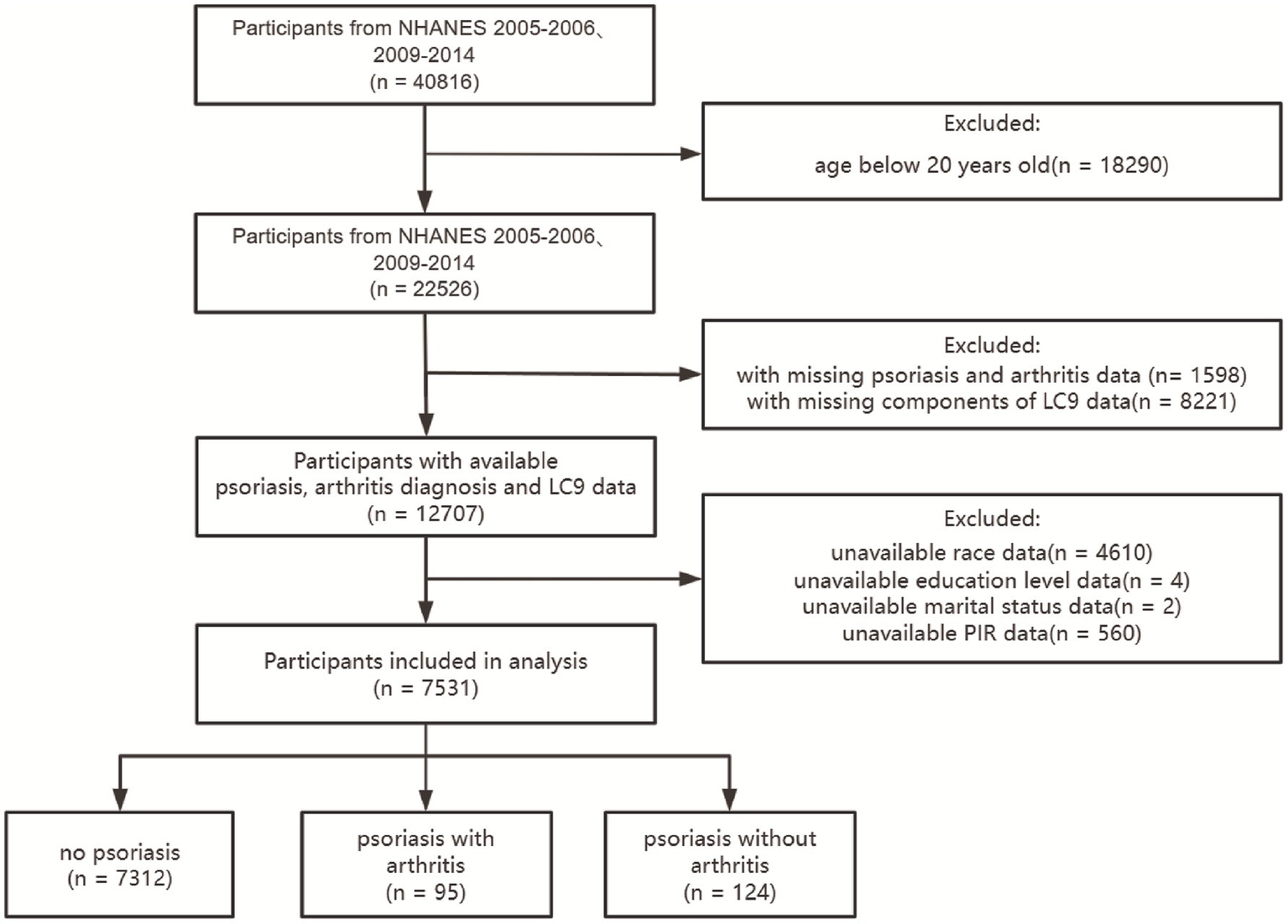 In this cross-sectional research, we analyzed data gathered during the 2005–2006 and 2009–2014 periods of the NHANES, adhering to the guidelines set by STROBE (Strengthening the Reporting of Observational Studies in Epidemiology). Our study focused on individuals who were 20 years of age or older and had comprehensive information regarding their LC9 scores, psoriasis, and arthritis. We excluded those who lacked essential demographic details, including race, marital status, education level or poverty-to-income ratio. Out of the 40,816 participants from the specified NHANES cycles, 7,531 were eligible based on our criteria. A flowchart detailing participant selection and inclusion is provided in Figure 1.