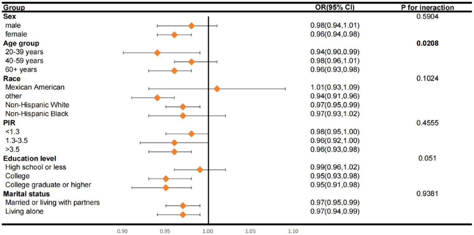Subgroup analyses were conducted to examine the relationship between LC9 and PsA in different populations, stratified by sex, age (as a categorical variable), race, education level, marital status, and PIR. Interaction significance was assessed by evaluating the p-values for the interaction terms between LC9 and the subgroup categories.
