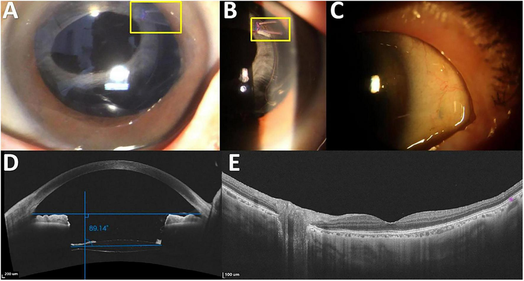 Figure 2. Surgical outcome in Case 1. (A) The intraocular lens (IOL)–capsular bag complex remains well-centered within the pupil, with the permanent polypropylene capsular hooks in situ. (B) Permanent polypropylene capsular hooks. (C) No suture exposure, erosion, or conjunctival inflammation is observed. (D) Anterior-segment optical coherence tomography (AS-OCT) image showing a well-centered IOL–capsular bag complex. The top horizontal blue line represents the reference line between the iridocorneal angles, whereas the bottom horizontal blue line represents the horizontal axis of the IOL. The angle between these two lines, relative to 90 degrees, indicates the IOL tilt (89.14 degrees in this example, minus 90 degrees, corresponding to a tilt of 0.86 degrees). (E) Macular OCT image showing no significant abnormalities during a follow-up period of at least 1 year. The yellow box highlights the permanent polypropylene capsular hook.