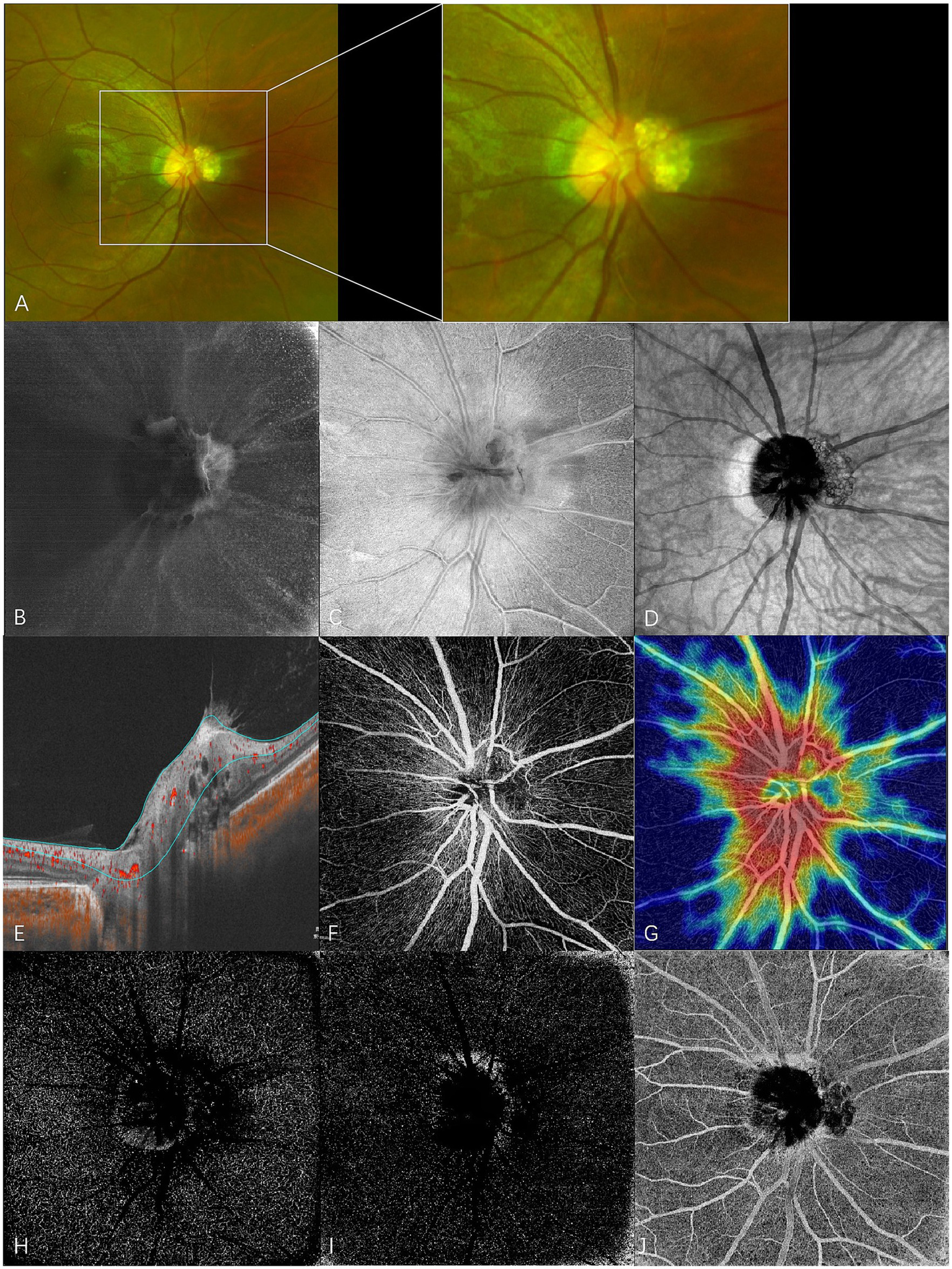 En face swept-source optical coherence tomography (SS-OCT) and SS-OCT angiography (SS-OCTA) of type 2 RAHs in TSC patient 4. (A) An ultra-wide-field scanning laser ophthalmoscope image (part) with local magnification shows juxtapapillary type 2 RAHs with a mulberry-like appearance. (B–D) en face SS-OCT. At the level of vitreous, irregular hyperreflectivity indicating the abnormal interaction between the lesion and vitreous is shown, and vitreoretinal traction on the lesion leads to the formation of radiating folds of the posterior vitreous cortex around the optic disk (B). The lesion is poorly defined, and the multi-calcified nodules appear isoreflective or hyporeflective at the level of the retinal nerve fiber layer (RNFL) (C). The mulberry-like appearance of type 2 RAHs is well presented at the segmentation of the choroid (D), shown as closely arranged isoreflective vesicles demarcated by hyporeflective rings. (E–J) SS-OCTA (ONH scan). Angio B-scan with flow overlay and radial peripapillary capillary (RPC) segmentation lines maps the flow to the walls surrounding moth-eaten cavities (E). RPC slab of SS-OCTA shows that the lesion has a sparse vascular network (F), and the vascular density is significantly low compared to the surroundings in the heatmap for RPC vascular density (G). Hyporeflective changes are shown at the segmentation of the deep capillary plexus (H) and outer retina (I), while mixed reflectivity is detected at the choriocapillaris segmentation (J).