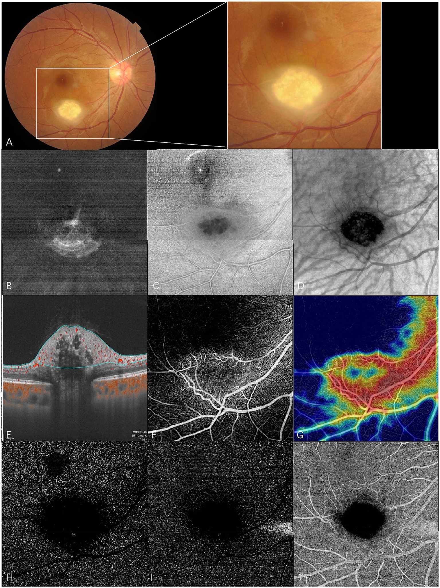 En face swept-source optical coherence tomography (SS-OCT) and SS-OCT angiography (SS-OCTA) of type 3 RAHs in TSC patient 2. (A) Color fundus photography with local magnification shows type 3 RAHs, an oval, gray-white semitransparent lesion with central calcifications, located at the inferotemporal arcade. (B–D) en face SS-OCT. At the level of vitreous, irregular hyperreflectivity representing vitreous thickening is shown, and radiating vitreoretinal traction on the lower part of the lesion is demonstrated (B). The lesion appears ill-defined with peripheral isoreflectivity, and central calcifications are unevenly hyporeflective at the level of the retinal nerve fiber layer (RNFL) (C). At the level of the choroid, central calcifications appear dark and well-delineated, while several isoreflective vesicles are detected within the dark area (D). (E–J) SS-OCTA (6 × 6 mm). Angio B-scan with flow overlay and radial peripapillary capillary (RPC) segmentation lines maps the flow mainly to the peripheral non-calcified component. No flow is detected within central empty optical spaces (E). The RPC slab of SS-OCTA shows the lesion that has an annular dense vascular network (F), and the vascular density is much lower in the central feeder as illustrated by the heatmap of vascular density at the RPC slab (G). The lesion appears dark at the segmentation of the deep capillary plexus (H), outer retina (I), and choriocapillaris (J), possibly due to the shadowing effect.