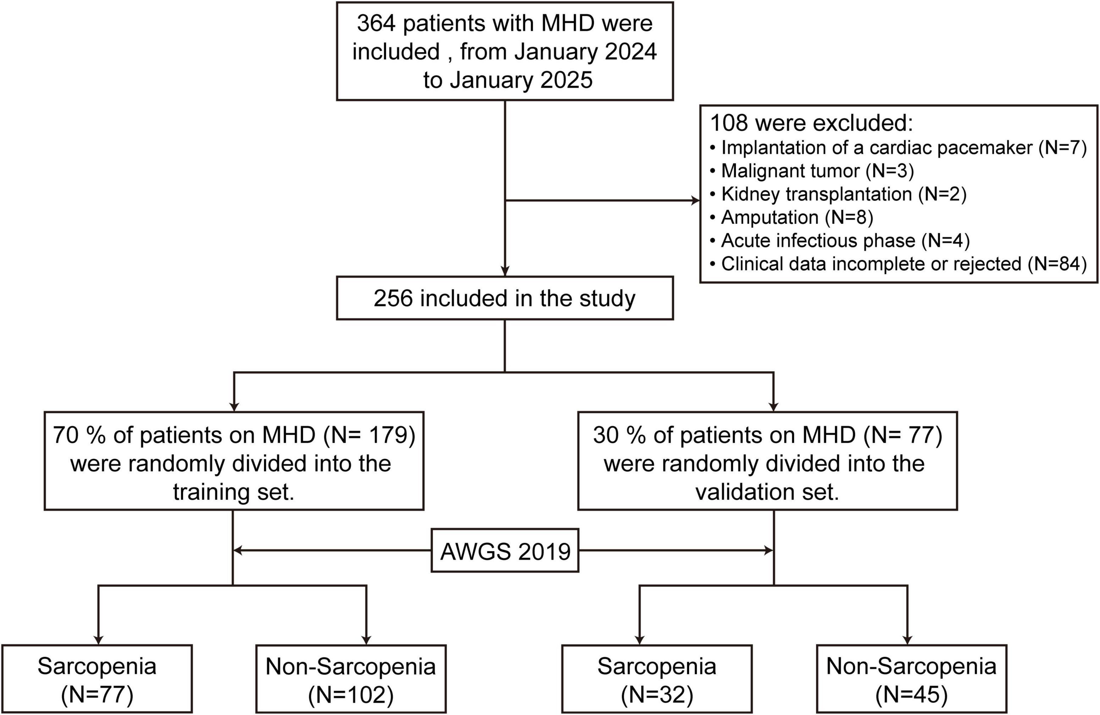 This study is a single-center, retrospective observational study conducted at Nanchong Central Hospital from January 2024 to January 2025. A total of 364 MHD patients were included, based on the following inclusion and exclusion criteria: (1) Inclusion Criteria: Age > 18 years, undergoing regular hemodialysis for more than 3 months, and receiving at least 2 dialysis sessions per week. (2) Exclusion Criteria: A history of pacemaker implantation, malignant tumors, kidney transplantation, or amputation; acute infection; incomplete clinical data; or refusal to participate.