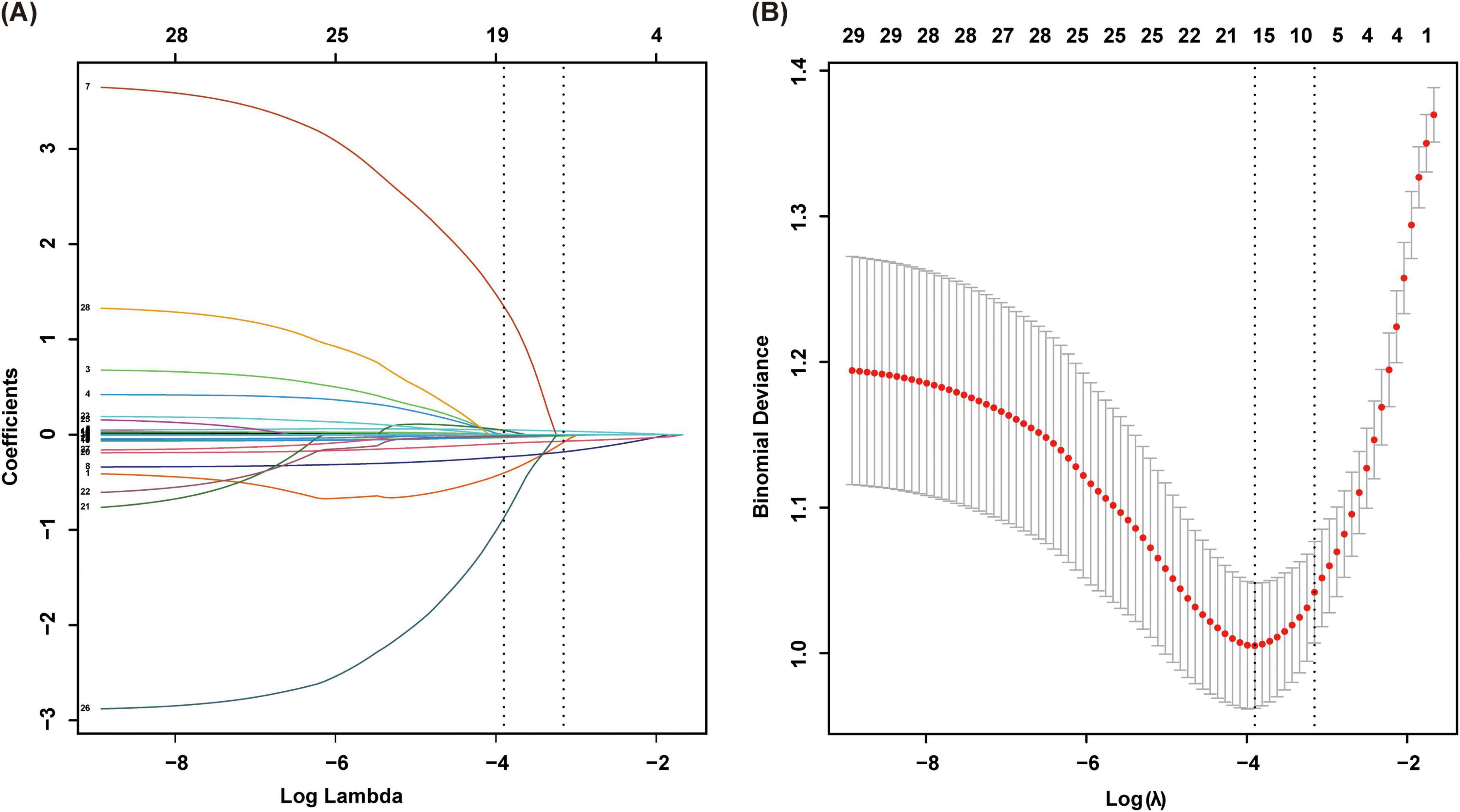 Figure 2. Variable selection using LASSO regression. (A) Path plot of LASSO regression coefficients, with 10-fold cross-validation used. Vertical lines indicate the selected values where the optimal lambda value results in eight non-zero coefficients. (B) Cross-validation curve of LASSO regression. Vertical dashed lines indicate the minimum mean squared error (λ = 0.02) and minimum distance standard error (λ = 0.043).