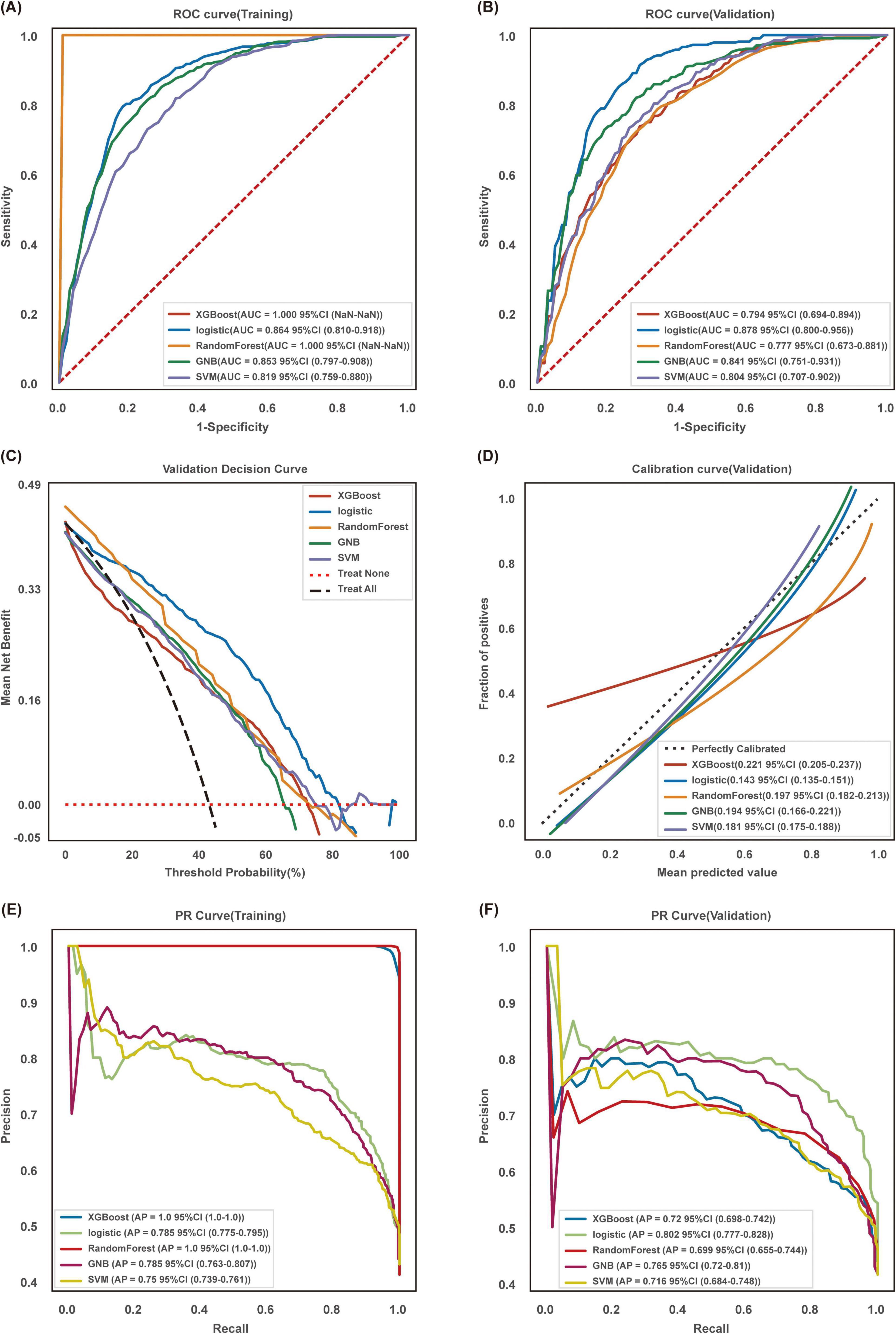 Figure 3. Comprehensive analysis of machine learning models. (A) AUC for the training set and (B) the validation set. (C) Decision curve analysis (DCA) for the validation set, where the black dashed line represents the hypothesis that all patients have sarcopenia, and the red dashed line represents the hypothesis that no patients have sarcopenia. (D) Calibration curve for the validation set, with the x-axis representing the average predicted probability and the y-axis representing the actual probability of events. The dashed diagonal line serves as the reference, and the smooth solid lines represent the model fit lines for different models. The closer the fit line is to the reference line, the smaller the value in parentheses, indicating more accurate model predictions. (E) PR curve and AP value for the training set. (F) The validation set. The y-axis represents precision and the x-axis represents recall. Different colors in the figure correspond to the respective models, with values presented as mean and 95% CI.