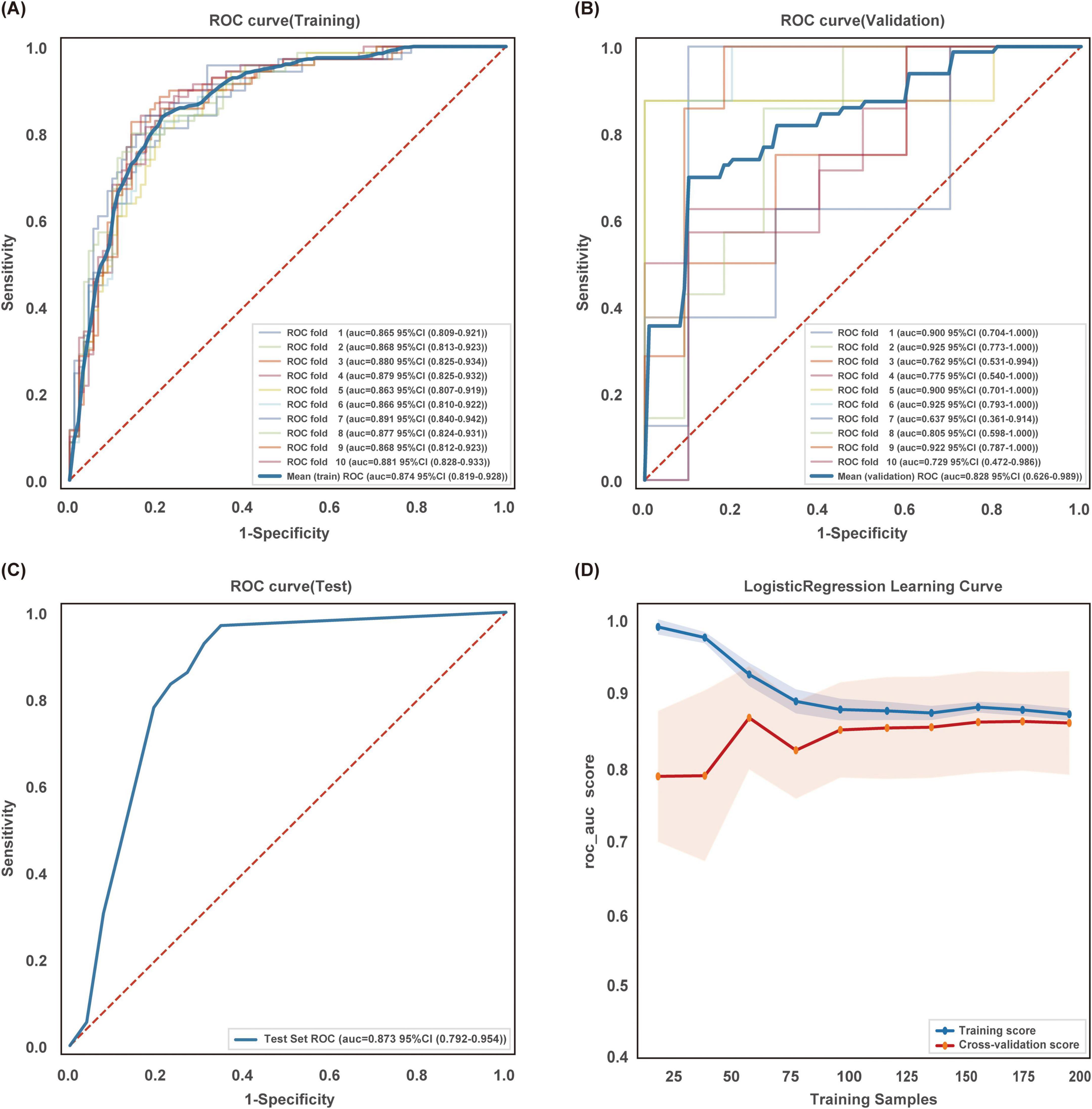 Figure 4. Training, validation, and testing of the logistic regression model. (A) ROC curve and AUC for the training set and (B) the validation set. Solid lines of different colors represent the results of 10-fold cross-validation. (C) ROC curve and AUC for the test set. (D) Learning curve. The solid blue line represents the training set, and the solid red line represents the cross-validation set. Each point represents the mean AUC (± SD), and the shaded areas represent the 95% confidence intervals. The curves converge with a small gap, indicating good generalization and model stability.