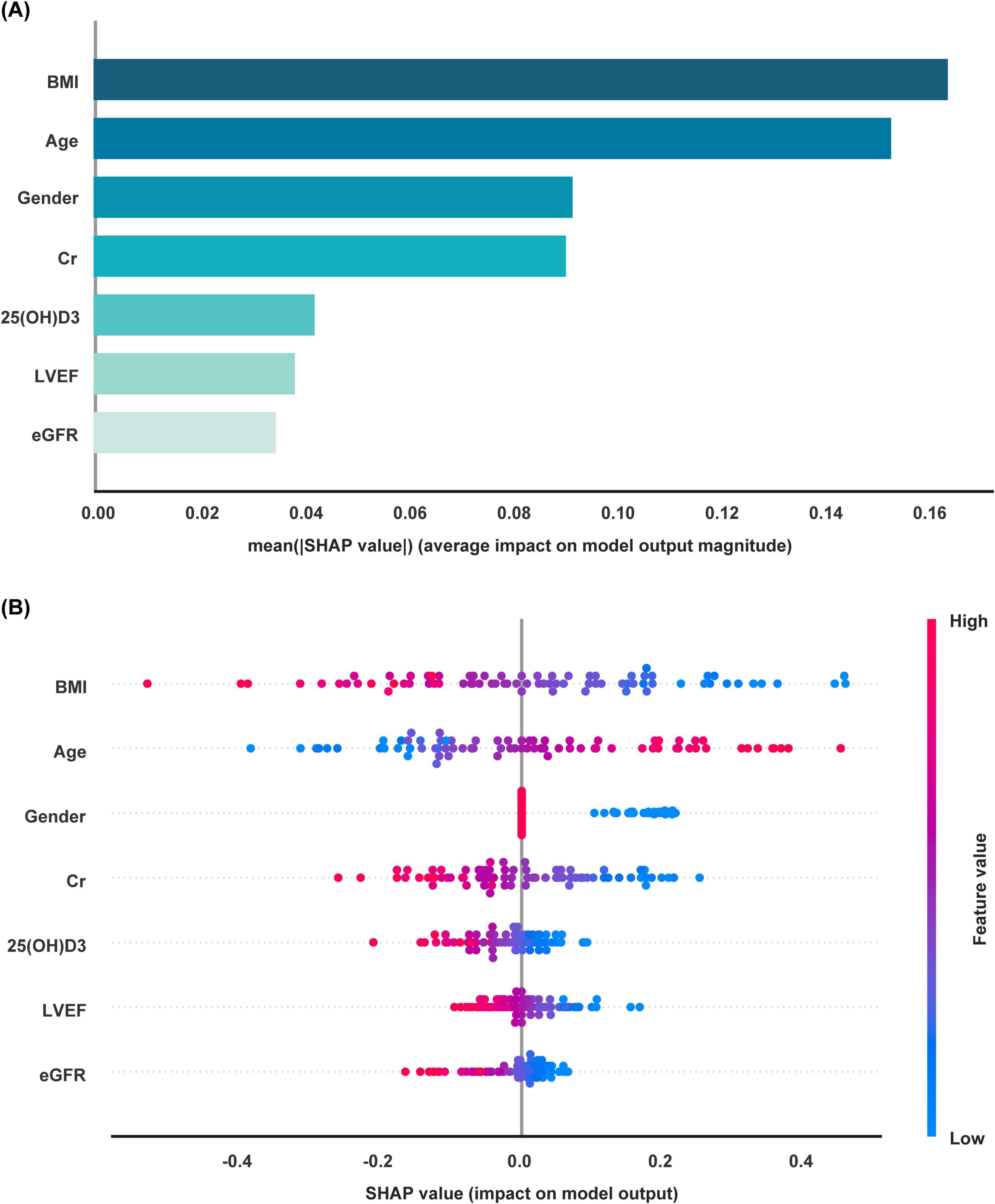 Figure 5. SHAP model interpretation. (A) Feature importance ranking. The matrix plot displays the importance of each covariate in the final prediction model. (B) SHAP summary plot showing the distribution of SHAP values for each feature. Each point represents the SHAP value of a feature for each patient, with the x-axis representing the SHAP value. The color gradient from red to blue indicates the feature value, from high to low.