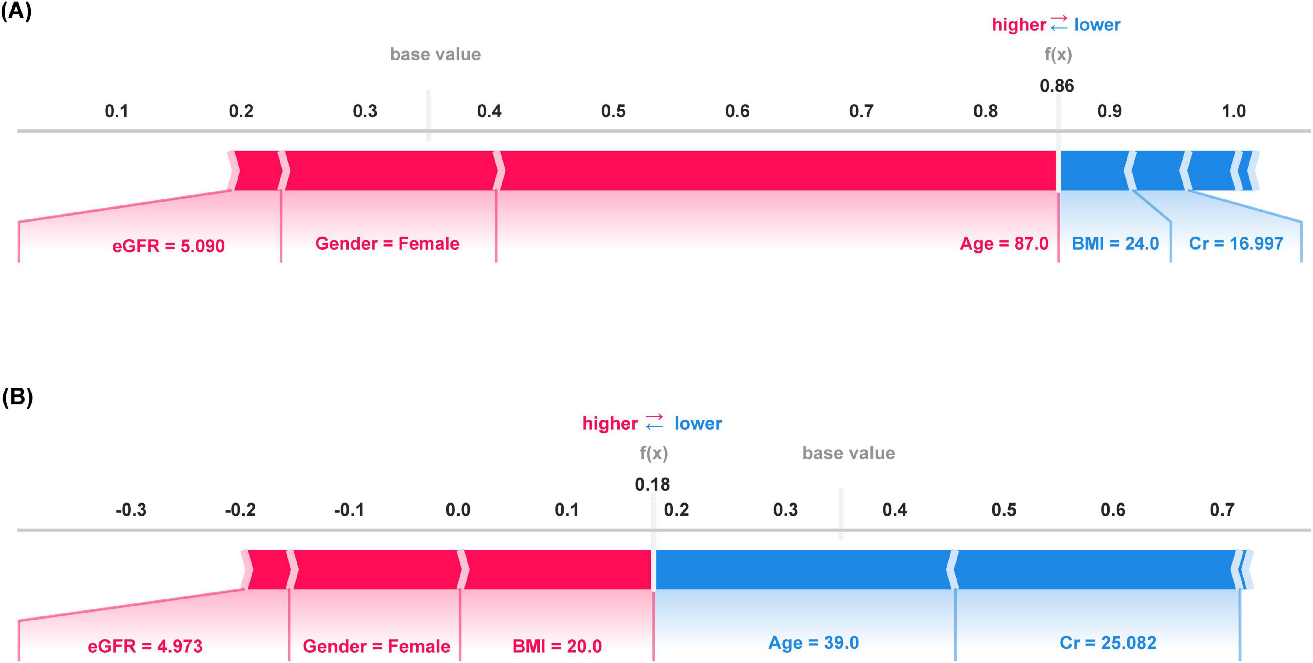 Figure 6. SHAP model interpretation for individual predictions. (A) SHAP force plot for patient A (true positive) and (B) SHAP force plot for patient B (True Negative). The length of the color bar represents the contribution value, with red indicating a positive contribution and blue indicating a negative contribution.