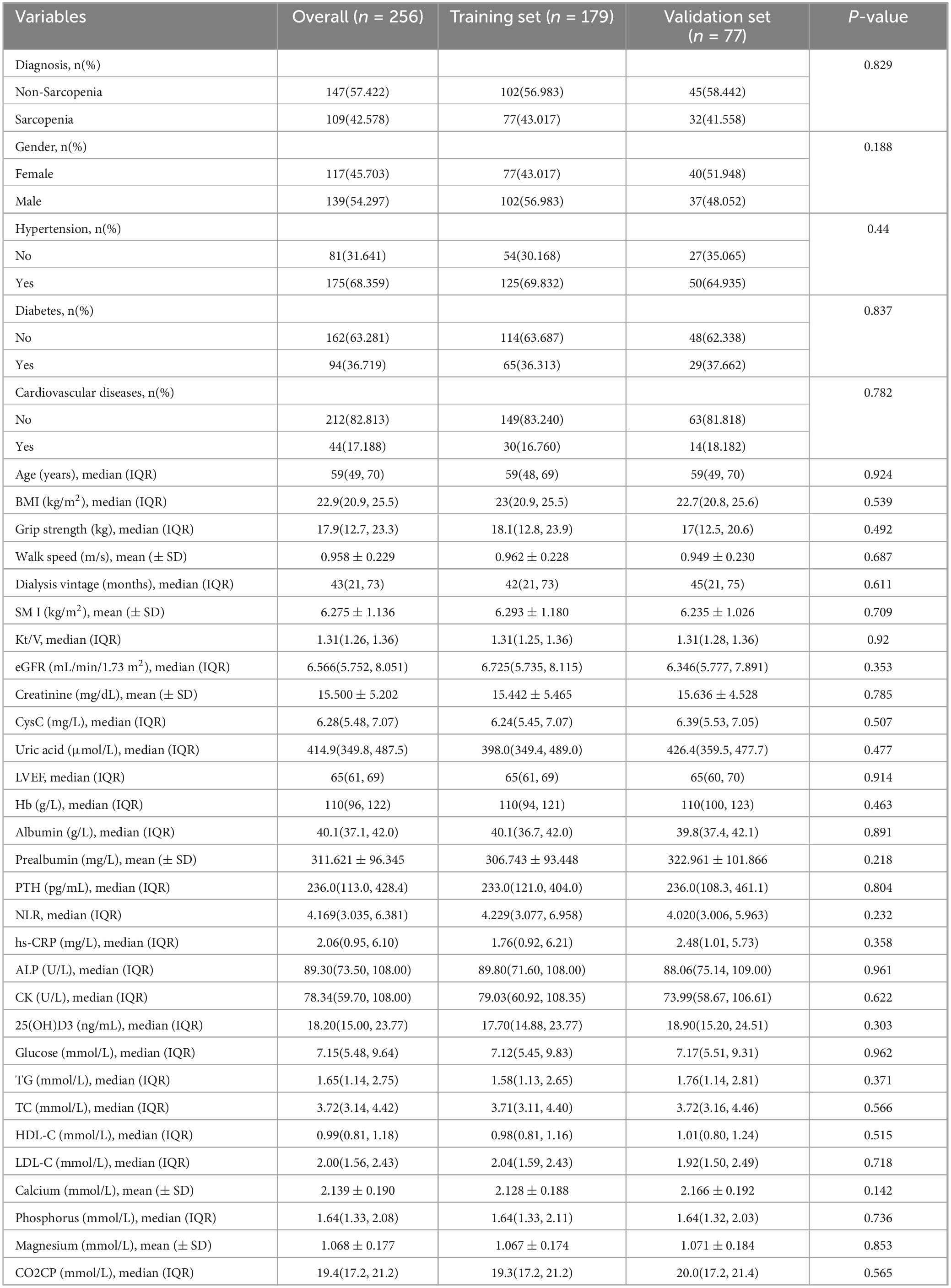 A total of 256 MHD patients were included in the study (Figure 1), with 139 males (54.2%) and 117 females (45.8%). Among the participants, 109 patients were diagnosed with sarcopenia (42.6%). The study population was randomly divided into a training set (n = 179) and a validation set (n = 77) at a 7:3 ratio. No significant differences were observed between the two groups in terms of demographic characteristics and major laboratory indicators (p > 0.05), ensuring a balanced data distribution (Table 1).