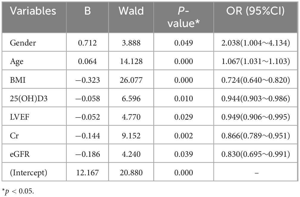 Key features were initially selected using LASSO regression with 10-fold cross-validation. An optimal λ value (λ = 0.043) was determined, selecting eight candidate features (Figure 2). To control for confounding factors, multivariate logistic regression was performed, identifying seven significant predictors: gender, age, BMI, 25(OH)D3, LVEF, Cr, and eGFR (Table 2). While many other nutritional and biochemical indicators showed potential associations in univariate analysis, they did not provide additional independent predictive value in the multivariate framework. These variables were significantly associated with sarcopenia risk (p < 0.05), providing a solid foundation for model construction.