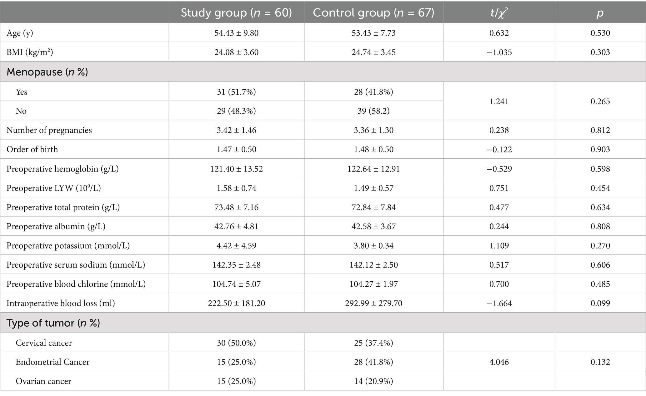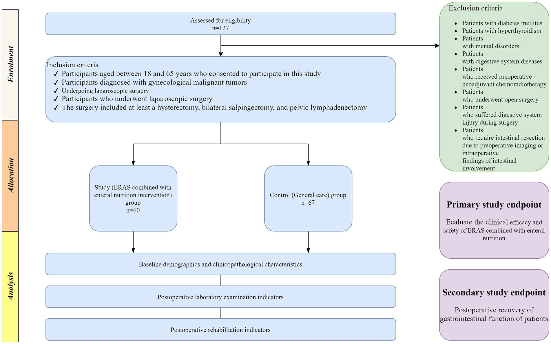 From January to December 2022, our hospital treated 127 patients with gynecological malignant tumors. These patients were selected for this research. Patients were divided into a study group and a control group for a prospective controlled study, based on their preferences. The study group underwent ERAS combined with enteral nutrition intervention, whereas the control group received general nursing care. The study group consisted of 60 cases, and the control group included 67 cases. Inclusion criteria were as follows: (1) Participants aged between 18 and 65 years who consented to participate in this study; (2) Participants diagnosed with gynecological malignant tumors (cervical cancer, endometrial cancer, ovarian cancer); Cervical cancer and endometrial cancer need to be diagnosed through preoperative pathological biopsy. Ovarian cancer patients are diagnosed through preoperative imaging examination, and the diagnosis is supported by postoperative pathological biopsy. (3) Participants who underwent laparoscopic surgery. Surgical treatment shall be carried out within 1 week after clinical diagnosis. (4) The surgery included at least a hysterectomy, bilateral salpingectomy, and pelvic lymphadenectomy. Exclusion criteria were as follows: (1) Patients with diabetes mellitus; (2) Patients with hyperthyroidism; (3) Patients with mental disorders; (4) Patients with digestive system diseases; (5) Patients who received preoperative neoadjuvant chemoradiotherapy; (6) Patients who underwent open surgery; (7) Patients who suffered digestive system injury during surgery; (8) Patients who require intestinal resection due to preoperative imaging or intraoperative findings of intestinal involvement. The implementation of this specific exclusion criterion is due to the significant changes in postoperative recovery pathways and nutritional management caused by intestinal resection, which may also increase the risk of complications such as anastomotic leakage and intestinal obstruction. The hospital ethics committee approved this study, all participating patients provided informed consent, and the work has been reported in line with the STROCSS criteria (18) (Figure 1).