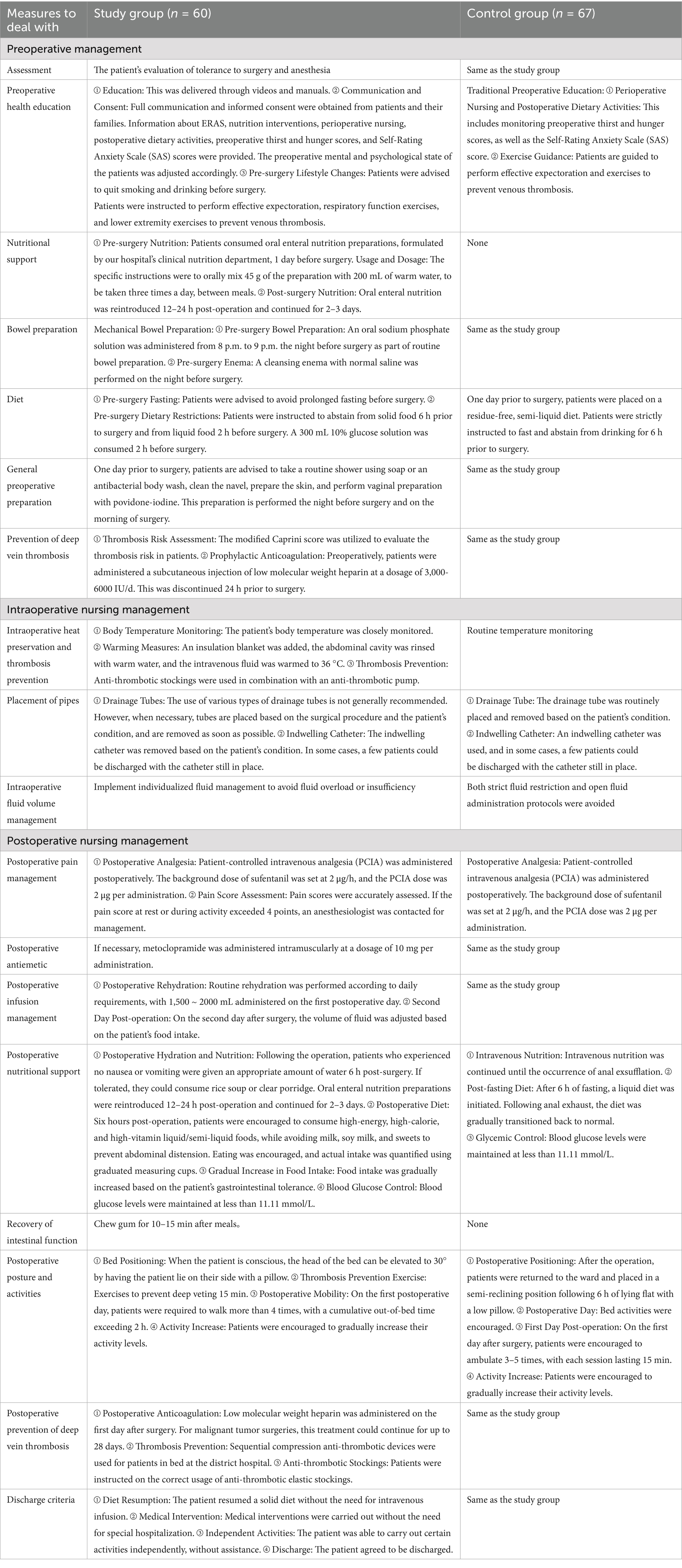 The control group patients were subjected to traditional nursing interventions, primarily comprising: (1) Pre-surgery: Patients’ health status was closely monitored, surgical treatment-related knowledge and precautions were explained, and patients and their families were guided to cooperate with surgery-related nursing and treatment procedures. (2) Pre-surgery Fasting: Patients were strictly required to fast and abstain from drinking for 6 h prior to surgery. An oral sodium phosphate solution was administered for routine bowel preparation from 8 PM to 9 PM the night before surgery. (3) Pre-surgery Enema: A cleansing enema with normal saline was administered on the night before surgery. (4) Intra-operation: The nursing staff strictly adhered to the requirements of anesthesiologists and surgeons, closely monitoring changes in patients’ vital signs and accurately recording them. (5) Post-operation: The nursing staff closely monitored patients for any abnormal conditions, administered analgesic drugs as per the doctor’s advice, and provided postoperative rehabilitation education (Table 1).