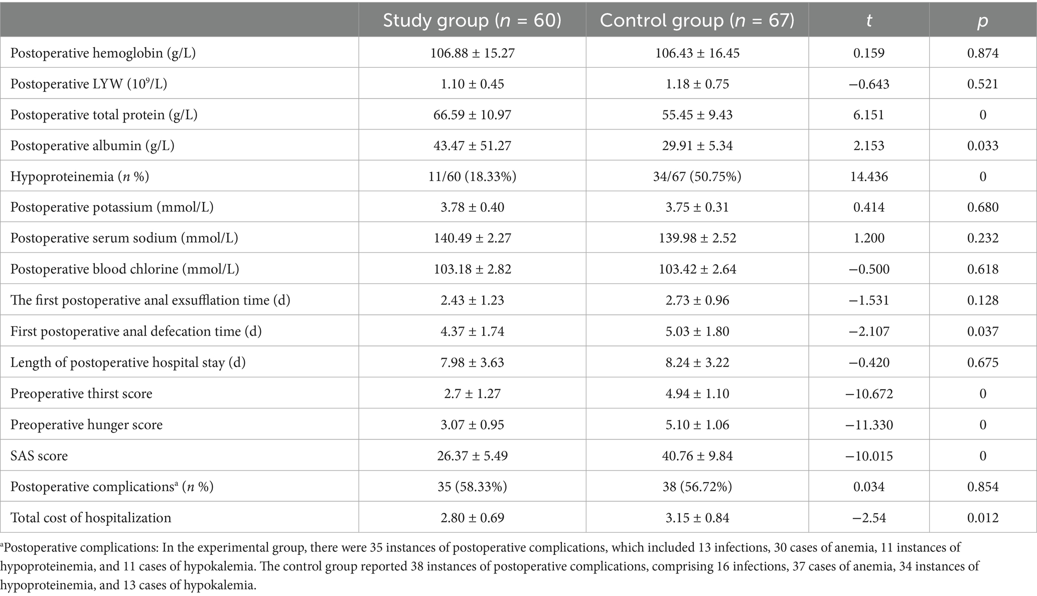 Results: The study group had higher postoperative total protein (66.59 ± 10.97 g/L) and albumin (43.47 ± 51.27 g/L) than the control group, with a significantly lower incidence of hypoproteinemia (18.33% vs. 50.75%, p < 0.05). There were no significant differences in hemoglobin, lymphocyte count, or electrolytes. The study group recovered bowel function earlier than the control group, with significant differences in defecation time (p < 0.05). No significant differences were observed in anal exhaust time, hospital stay, complications, or total costs. The study group had better anxiety, thirst, and hunger scores (p < 0.05).