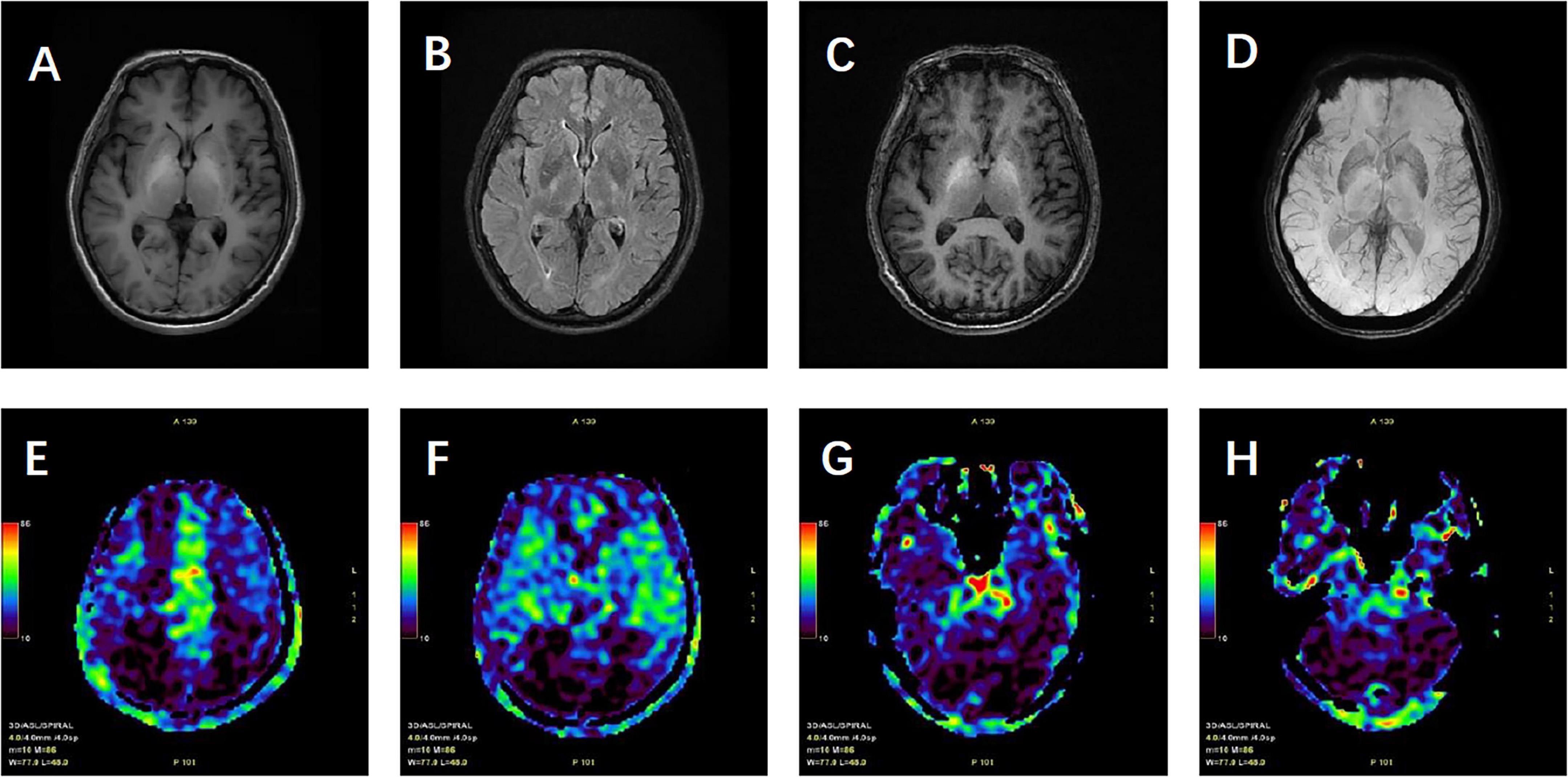 Figure 1. Patient’s cranial magnetic resonance imaging findings. (A) T1-weighted images (T1WI) showing high signal intensity with symmetrical distribution in the bilateral pallidum. (B) T2-weighted fluid-attenuated inversion recovery (T2 FLAIR) showing no abnormal high signal. (C) Contrast-enhanced T1WI (T1WI + C) demonstrating uniform enhancement of the bilateral pallidum. (D) Susceptibility-weighted imaging (SWI) with no significant abnormalities noted. (E–H) Arterial spin labeling (ASL) revealing hypoperfusion in the bilateral frontal, parietal, part of temporal, occipital lobes and cerebellum.