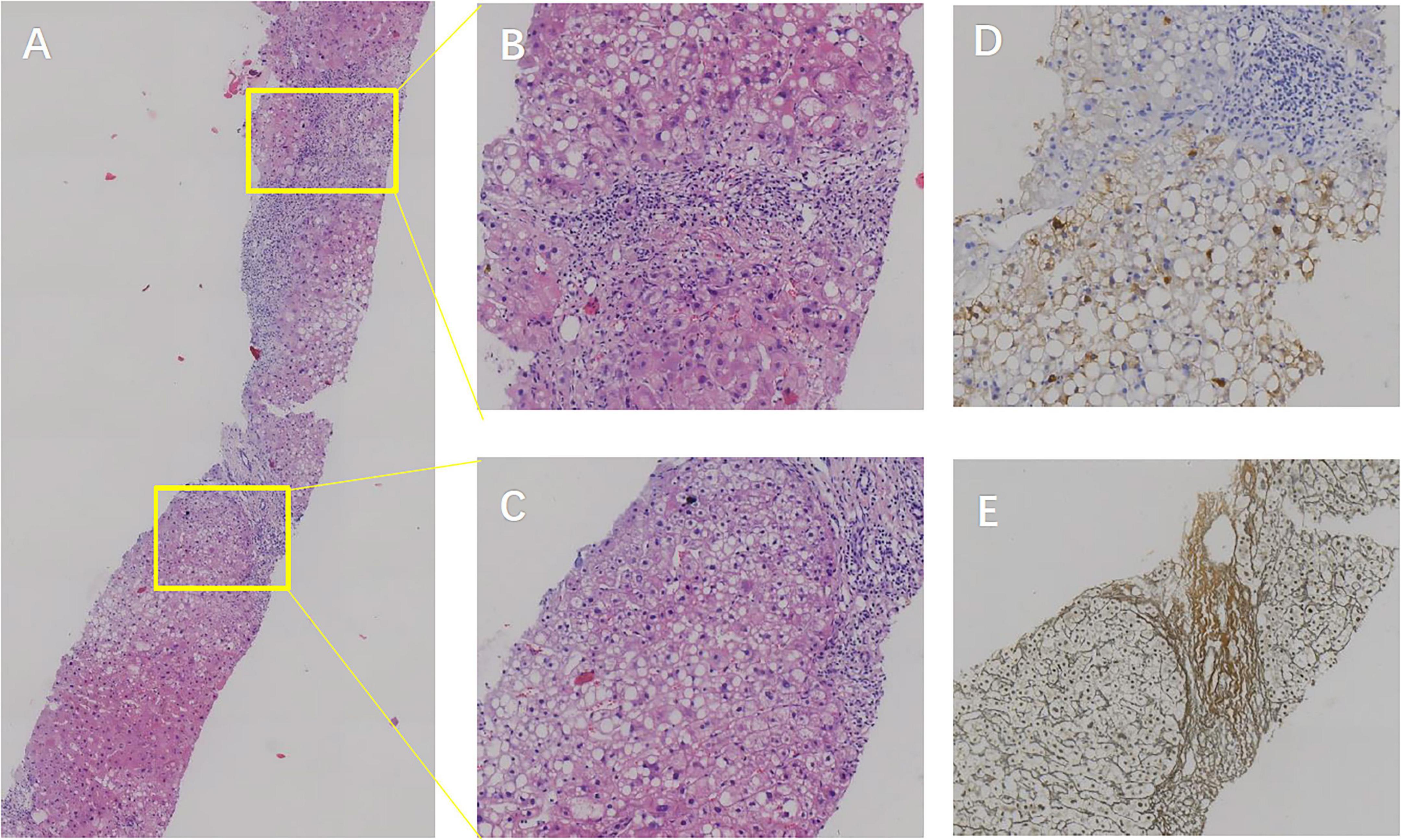 Figure 3. Patient’s liver biopsy findings. (A) Hematoxylin and eosin (H&E) staining at 5× magnification showing poorly arranged hepatic plates within lobules, hepatocyte cytoplasmic laxity, eosinophilic degeneration, and ballooning. Mallory vesicle formation and macrovesicular as well as vesicular steatosis are observed in lobule III. (B,C) H&E staining at 20× magnification revealing scattered moderate focal necrosis in hepatic lobules, with local bridging necrotic formation, mild central vein inflammation, active sinusoidal cellular reactions, lymphocytic infiltration in the sinusoids, and visible perisinusoidal fibrosis. The confluence area shows mild to moderate enlargement, lymphocytic and plasma cell infiltration, interstitial fibroplasia, fibrous septum formation, focal lobular structural disorders, and incomplete pseudolobule formation. (D) HBsAg staining at 20× magnification highlighting positive hepatitis B surface antigen expression. (E) Reticulocyte fiber staining at 20× magnification displaying positive reticulocyte fibers, indicative of fibrous activity.