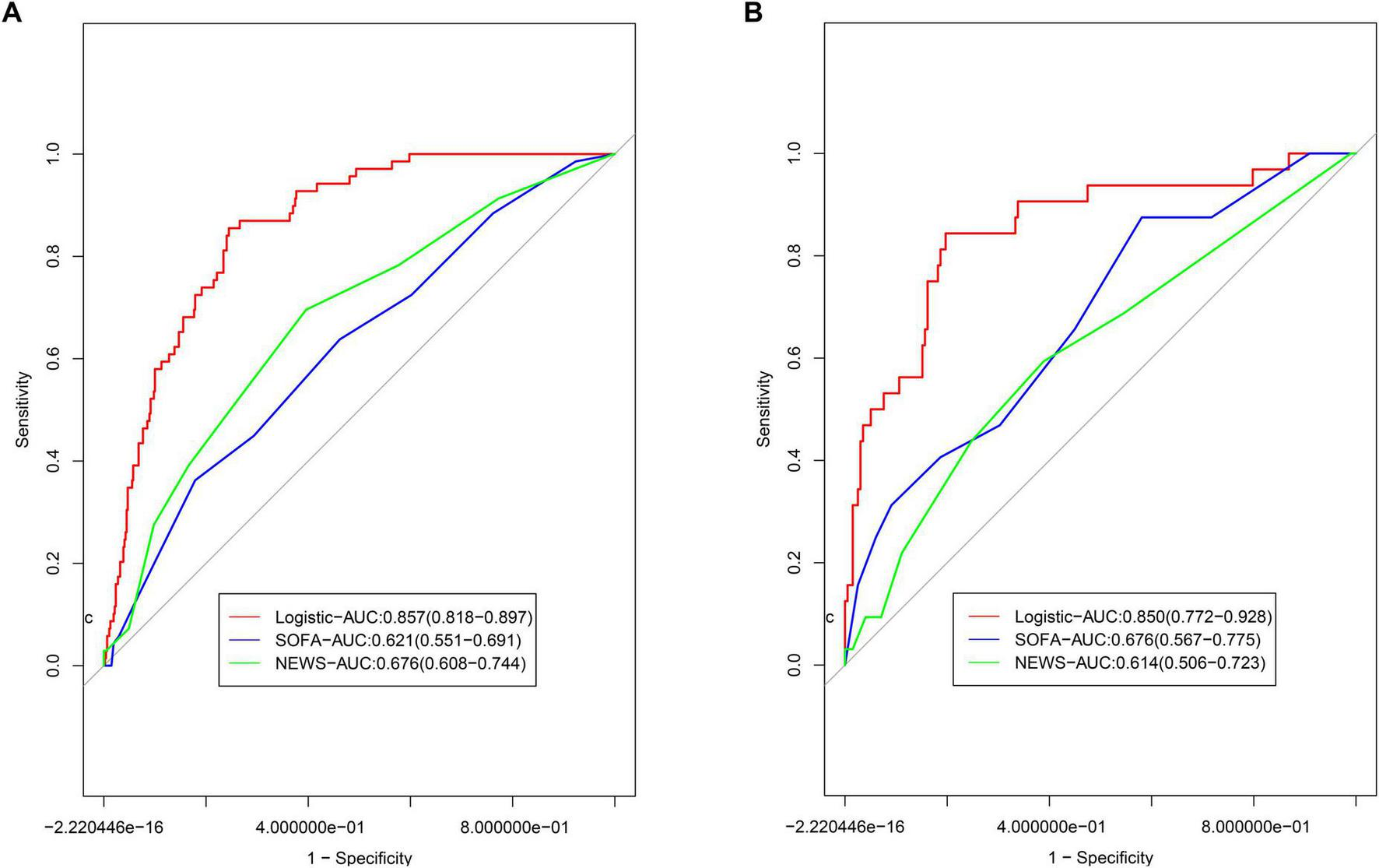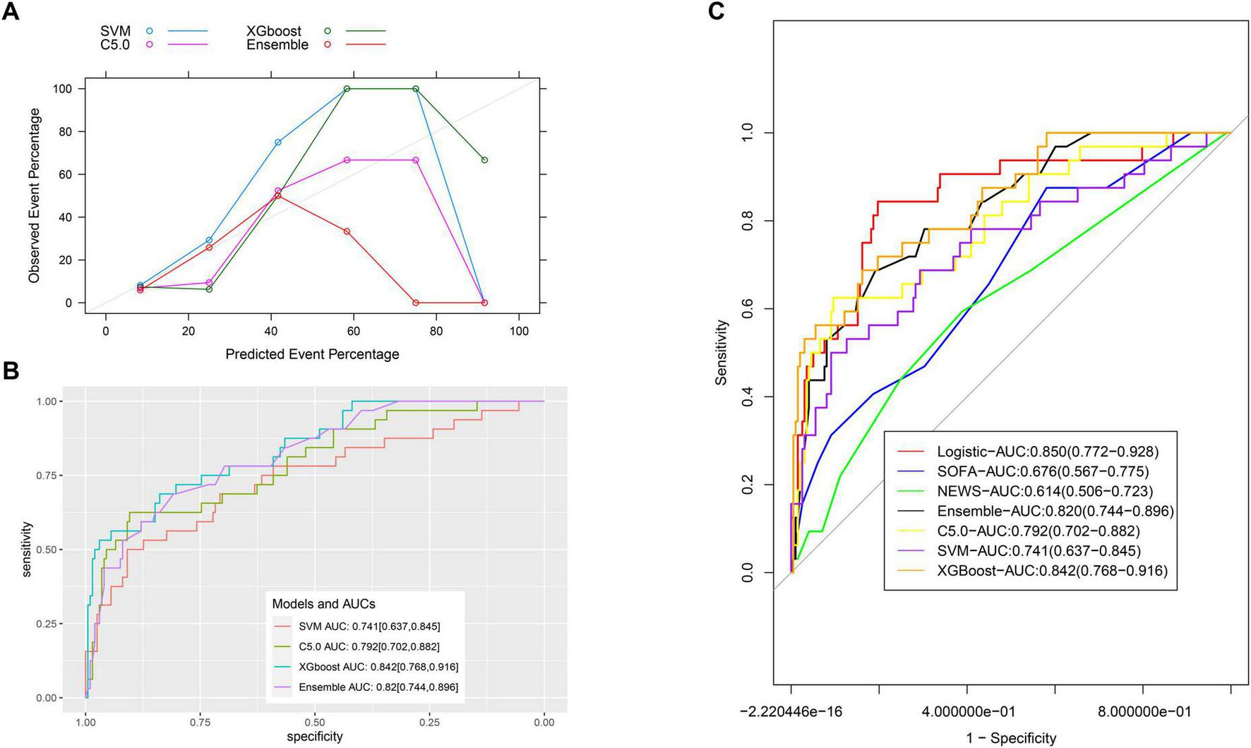 Sequential Organ Failure Assessment and NEWS-based predictive models were developed and compared to the nomogram using Delong’s test (P < 0.05 indicating statistical significance). Machine learning models [Support Vector Machine (SVM), C5.0, Extreme Gradient Boosting (XGBoost), and Ensemble] were constructed in the validation group. An integrated model was developed using the Stacking method and compared to the nomogram using Delong’s test.