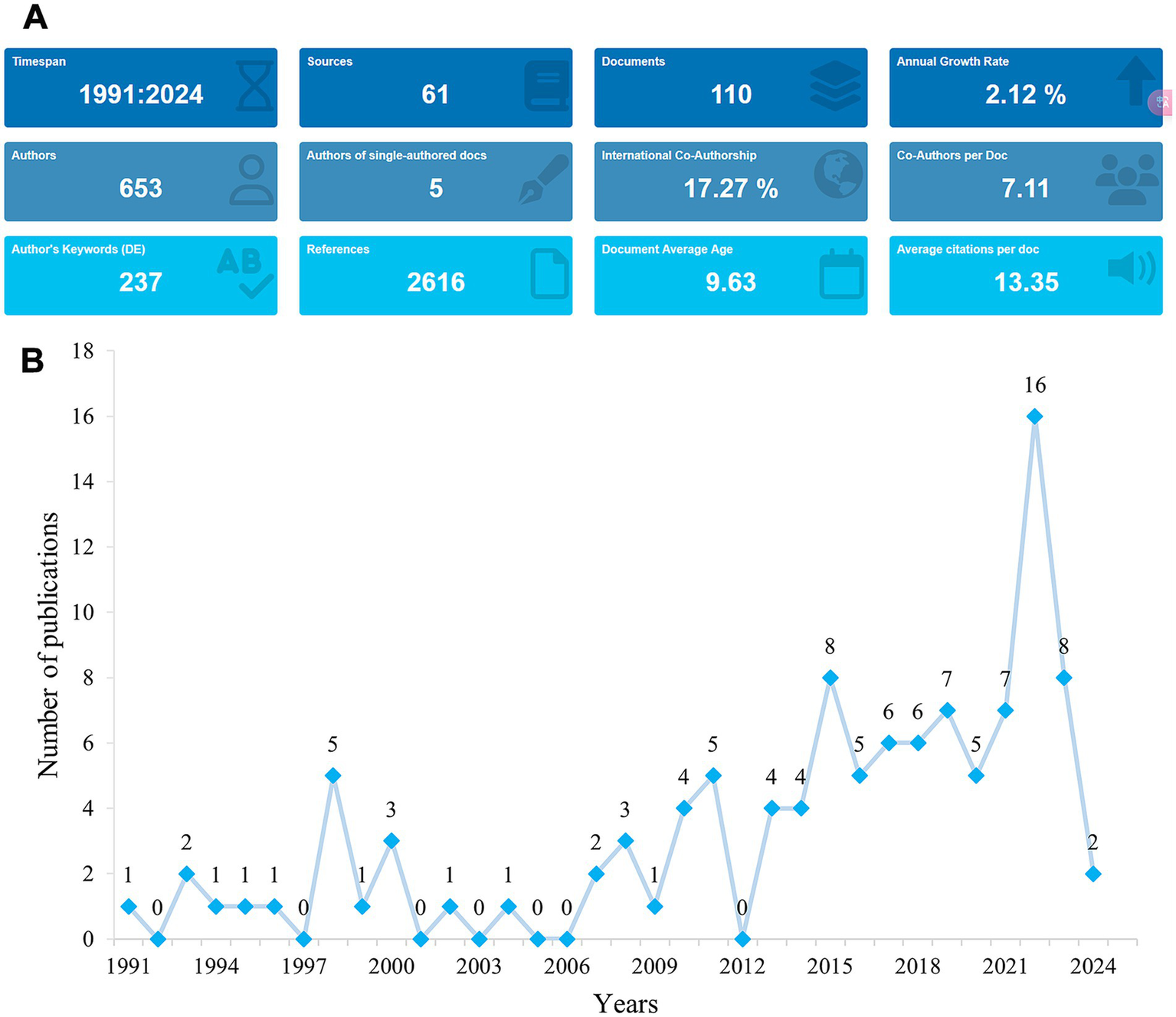 Trends in publications in rhGH treatment in ISS from 1991 to 2024. (A) Graphical overview of the total publications per year. (B) Detailed trend analysis showing the annual fluctuations in publication volume.