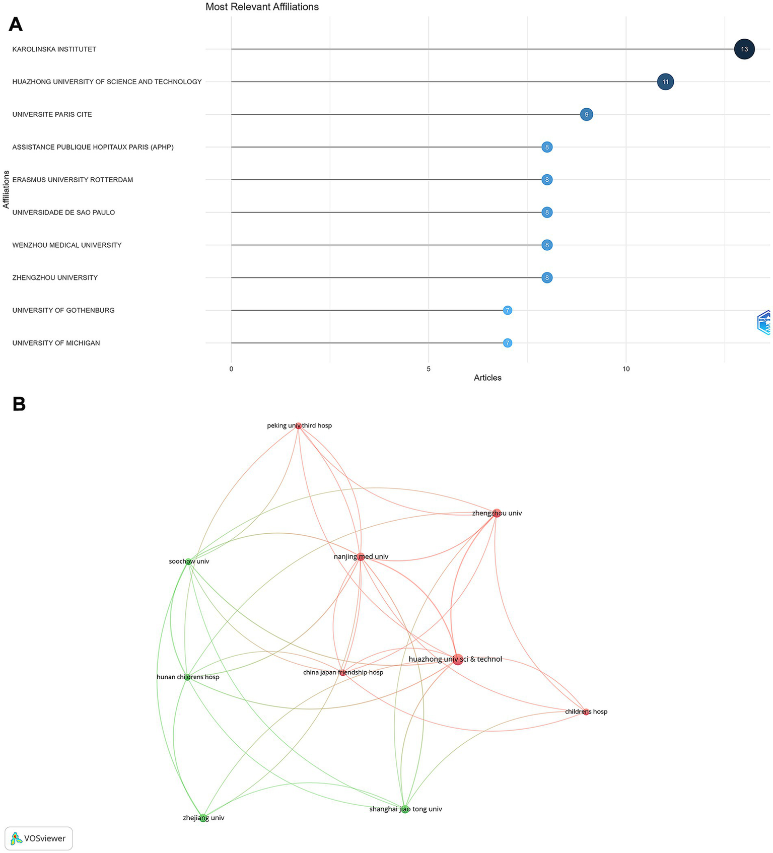 Institutional contributions and collaborations in rhGH treatment in ISS. (A) Top 10 institutions by article count and rank. (B) Collaboration map among institutions.