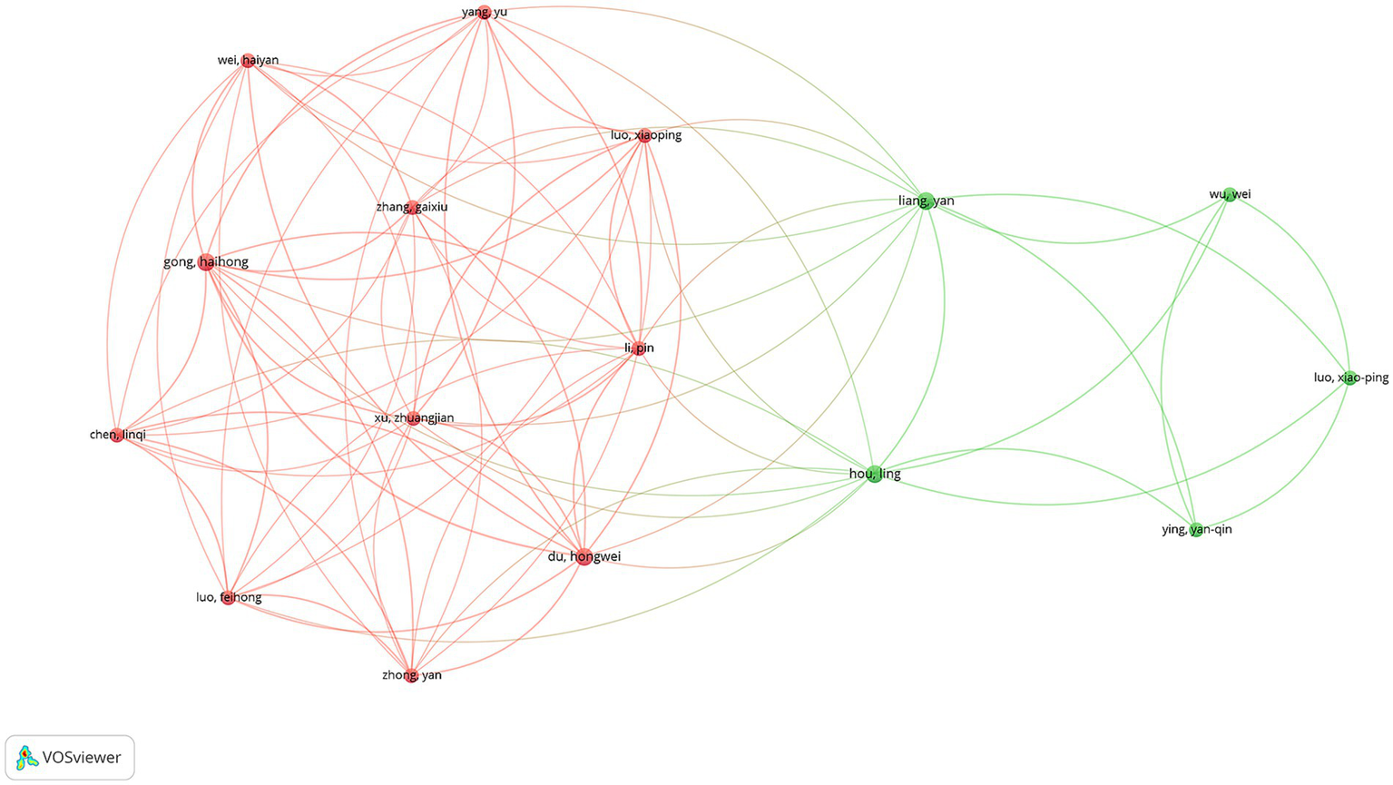 A total of 668 unique authors contributed to the 110 articles analyzed. Focusing on international collaborations, 59 authors were identified as having contributed to at least three publications. Among these, Luo XP was the most prolific author, with 6 publications, followed by Albertsson-Wikland K and Kim HS, each with 5 publications. In terms of total citations (TCs), Albertsson-Wikland K ranked first with 171 citations, while Ranke MB was close behind with 166 citations (Supplementary Table S3). The co-authorship network analysis revealed two major clusters of collaborating authors (Figure 6). The largest cluster, highlighted in red, was centered around Yang Yu, Wei Haiyan, and Gong Haihong, indicating a strong collaborative network primarily composed of Chinese researchers. This cluster demonstrated dense interconnections, suggesting close collaboration among these authors. The second significant cluster, shown in green, was centered around Liang Yan, Wu Wei, and Hou Ling, also representing a collaborative network predominantly among Chinese researchers.