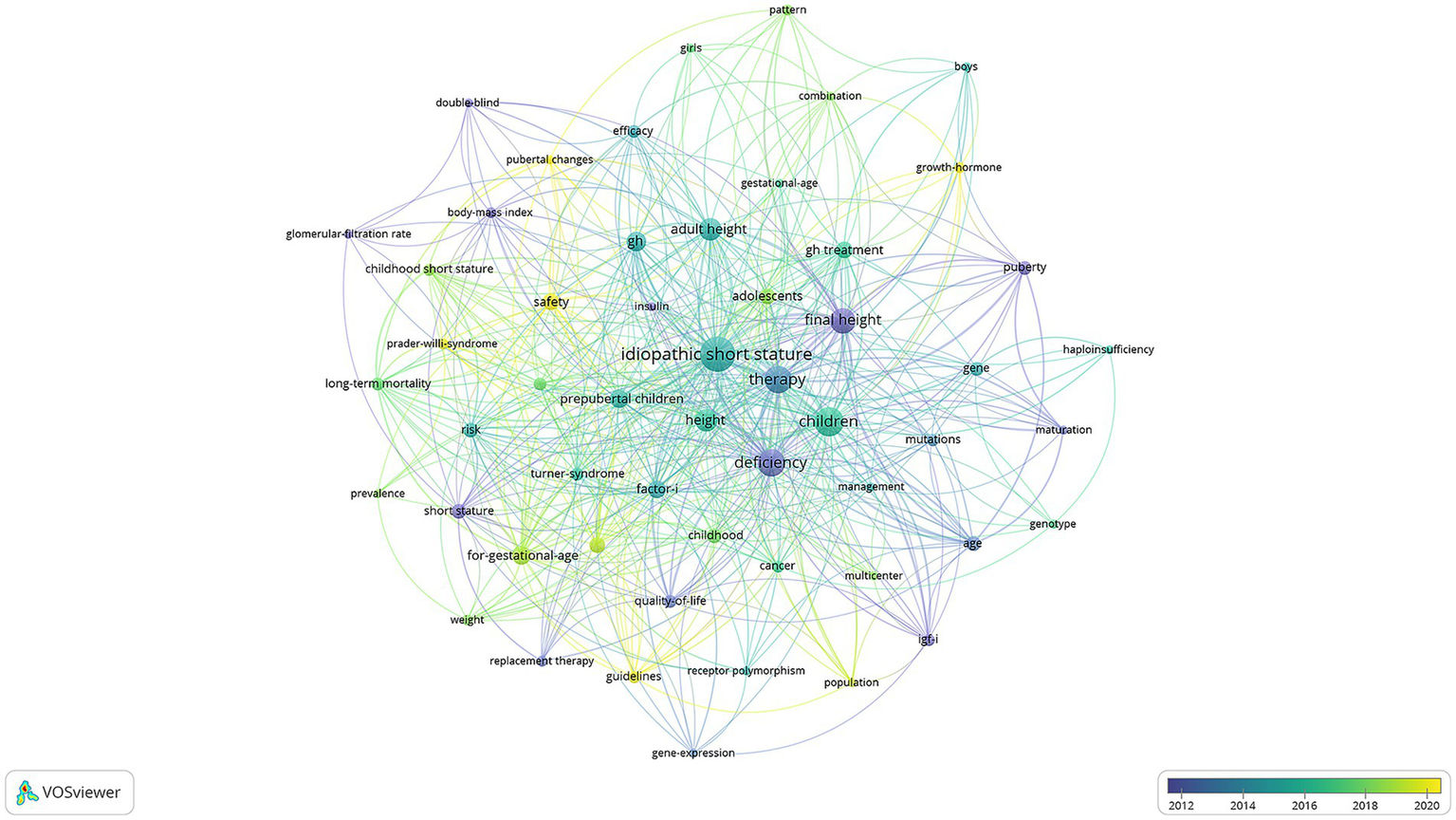 The treatment of idiopathic short stature (ISS) with recombinant human growth hormone (rhGH) has been a subject of extensive research. This study aims to perform a bibliometric analysis of publications related to rhGH treatment for ISS, identifying research hotspots, key publications, and international collaboration networks.