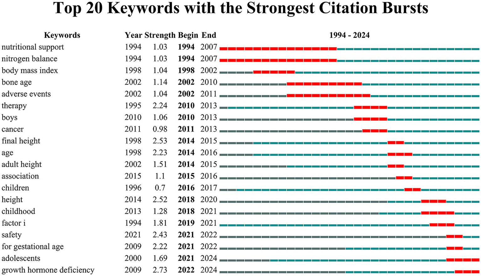 Over the past three decades, research on ISS and rhGH therapy has evolved from foundational studies to more nuanced investigations into safety, efficacy, and personalized treatment approaches. Temporal trends in keyword bursts demonstrate the shifting priorities of the field, corresponding to advances in both clinical practice and scientific understanding.