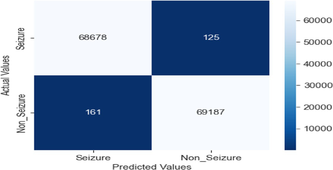 Several studies have employed traditional ML techniques for seizure detection and classification, often focusing on feature extraction and selection methods. Fergus et al. (6) proposed a supervised ML method using the real dataset, achieving a sensitivity and specificity of 88%. This study demonstrated the potential of traditional ML methods in creating generalizable seizure detection models. Raghu et al. (7) presented a model that is computationally efficient by using a new feature known as a successive decomposition index. The system was evaluated using three different databases. Authors proposed support vector machine (SVM) classifiers, they achieved high sensitivity (95.80–97.53%) and low false detection rates (0.4–0.57/h) across all datasets. The use of multiple datasets in this study provided robust validation of their approach, highlighting the importance of diverse data in developing reliable seizure detection methods. Rani et al. (8) developed SVM approach for classifying a peak signal EEG signal. The system was used dataset that collected from Bonn University dataset. The SVM model achieved a remarkable 99.60% accuracy rate and a low error rate of 0.039. Almustafa (9) conducted a comprehensive comparison of various ML. These studies have demonstrated the continued relevance and effectiveness of traditional ML approaches in seizure detection, particularly when combined with innovative feature extraction methods. The high accuracies achieved by these methods suggest that they remain competitive with more complex DL approaches in certain scenarios.