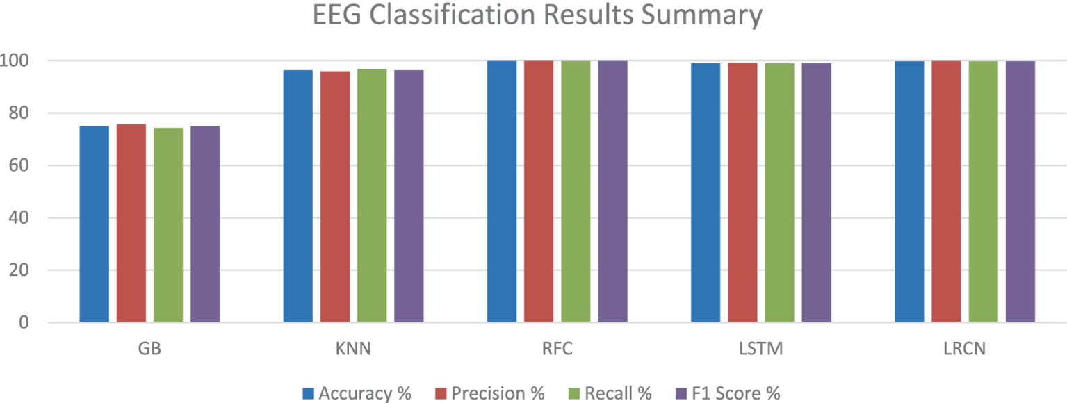 Figure 1 illustrates a summary of the EEG classification results. It provides a visual representation of how different EEG signals have been classified and shows the accuracy and performance of the classification model. It presents the various metrics and comparisons, helping to understand the effectiveness of the approach used to distinguish between different brain wave patterns.