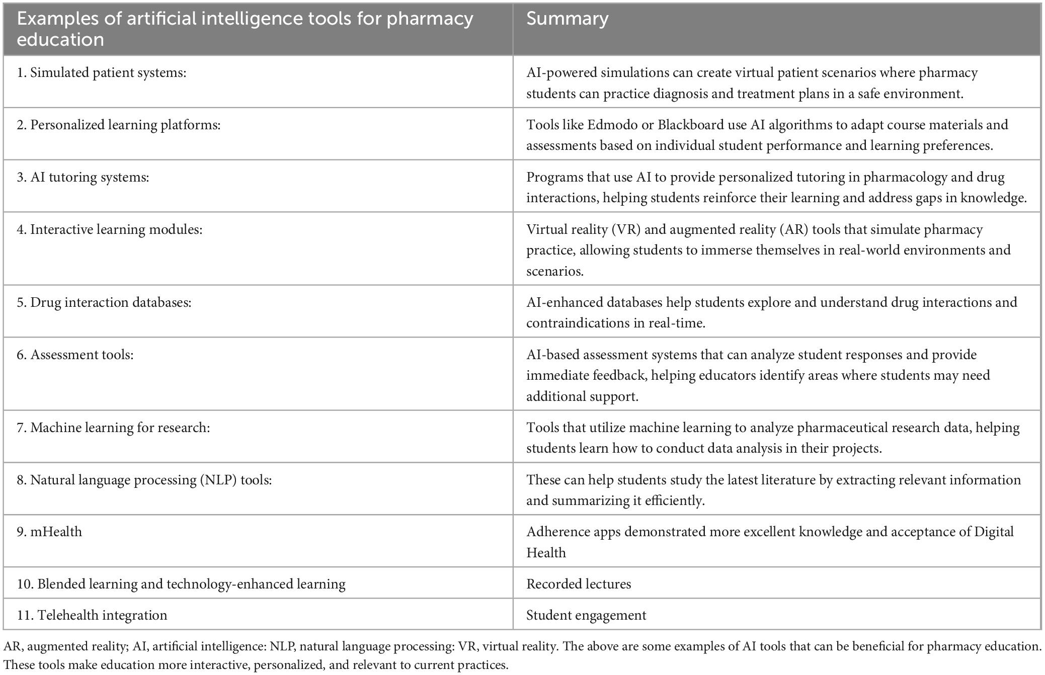 The benefits of Artificial Intelligence in pharmacy education are numerous and can significantly enhance the learning experience for students and improve the overall educational process. Via personalized learning AI can tailor educational content to meet individual students’ needs, helping them grasp complex concepts at their own pace. This customization can lead to improved understanding and retention of syllabi. Further, interactive learning environments provided by AI-powered tools can provide immersive simulations and interactive scenarios that make learning more engaging. This hands-on approach can help students apply theoretical knowledge in practical situations. AI can assist students in quickly finding relevant research papers, case studies, and clinical guidelines, enhancing their ability to stay updated with the latest developments in pharmacy (access to vast resources). AI can streamline the assessment process by providing instant feedback on quizzes and assignments (assessment and feedback). This timely information allows students to identify areas where they need improvement and foster continuous learning. AI can analyze trends and patterns in student performance, helping educators identify at-risk students early and implement targeted interventions to support their success (predictive analytics). AI can aid in drug discovery and pharmacological research, providing students with valuable insights into the latest technologies and methodologies being used in the field. AI can assist with administrative responsibilities, allowing educators to spend more time focusing on teaching and mentoring students. AI platforms can facilitate collaboration among students (collaborative learning), enabling them to work on group projects and share knowledge more effectively, regardless of their geographical locations. By integrating AI into pharmacy education, institutions can enhance educational experience, better prepare students for their careers, and ultimately improve healthcare outcomes (18, 20, 21, 29, 30, 33).