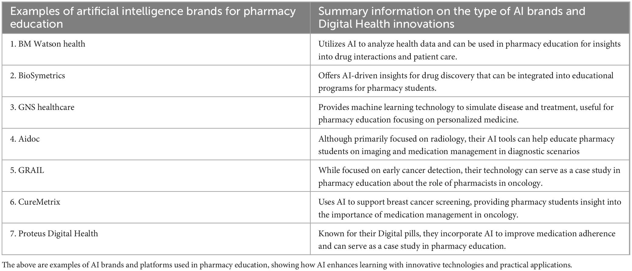 Table 6 depicted the advantages and disadvantages of Digital Health innovations in curriculum integration and transformation in pharmacy education. Further Table 7 have presented examples of AI tools for pharmacy education such as augmented reality (AR), Artificial Intelligence (AI), Natural Language Processing (NLP), Virtual reality (VR). These AI tools can be beneficial for pharmacy education that permit more interactive, personalized, and relevant learning to current practices. More examples of AI brands for Digital Health innovations in pharmacy education were exhibited in Table 8. These brands and platforms can be used in pharmacy education, showing how AI enhances learning with innovative technologies and practical applications.