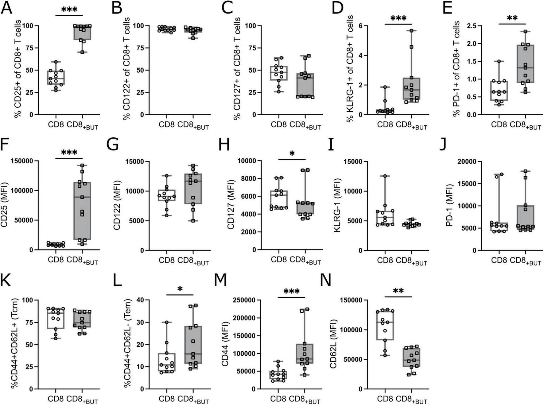 Butyrate increases activation of CD8+ T cells in vitro. OT-I CD8+ T cells were cultured with IL-2, anti-CD3 + anti-CD28 in the presence or absence of butyrate for three days then analyzed via flow cytometry. (A) Frequency of CD25+ cells. (B) Frequency of CD122+ cells. (C) Frequency of CD127+ cells. (D) Frequency of KLRG-1+ cells. (E) Frequency of PD-1+ cells. (F–J) MFI of CD25, CD122, CD127, KLRG-1, PD-1. (K) Frequency of CD44+CD62L+ (Tcm) cells. (L) Frequency of CD44+CD62L– (Tem) cells. (M,N) MFI of CD44 and CD62L. Data show box plots of five independent experiments. n = 11 mice per group, Friedman test with Dunn’s multiple comparisons test. *p ≤ 0.05, **p ≤ 0.01 ***p ≤ 0.001.
