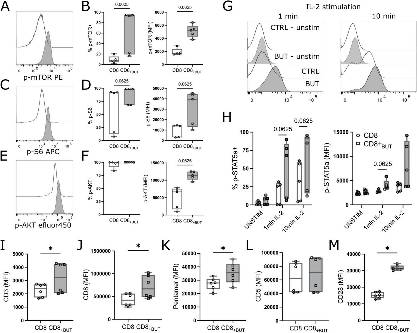 Butyrate enhances mTOR signaling, IL-2 signaling and expression of TCR molecules in vitro. OT-I CD8+ T cells were cultured with IL-2, anti-CD3 + anti-CD28 in the presence or absence of butyrate for three days. Cells were then serum starved and treated with IL-2 for 1 or 10 mins then analyzed via flow cytometry. [(A,C,E); left] Representative histograms of p-mTOR, p-S6 or p-AKT MFI between butyrate-treated (blue) and control (gray) T cells. [(A,C,E); right] frequency of p-mTOR+ p-S6+ or p-AKT+ T cells. (B) MFI of p-mTOR. (D) MFI of p-S6. (F) MFI of p-AKT. (G) Histograms of p-STAT5a between treatments after 1 min and 10 mins of IL-2 (50 IU) stimulation. (H) Frequency (left) and MFI (right) of p-STAT5a+ cells between treatment groups. (I–M) OT-I CD8+ T cells were cultured with IL-2, anti-CD3 + anti-CD28 in the presence or absence of butyrate for three days then analyzed via flow cytometry. MFI of CD3, CD8, H2KB SIINFEKL pentamer, CD5 and CD28. Data show box plots of two independent experiments. n = 5–6 mice per group. Wilcoxon matched pairs signed rank test. *p < 0.05.