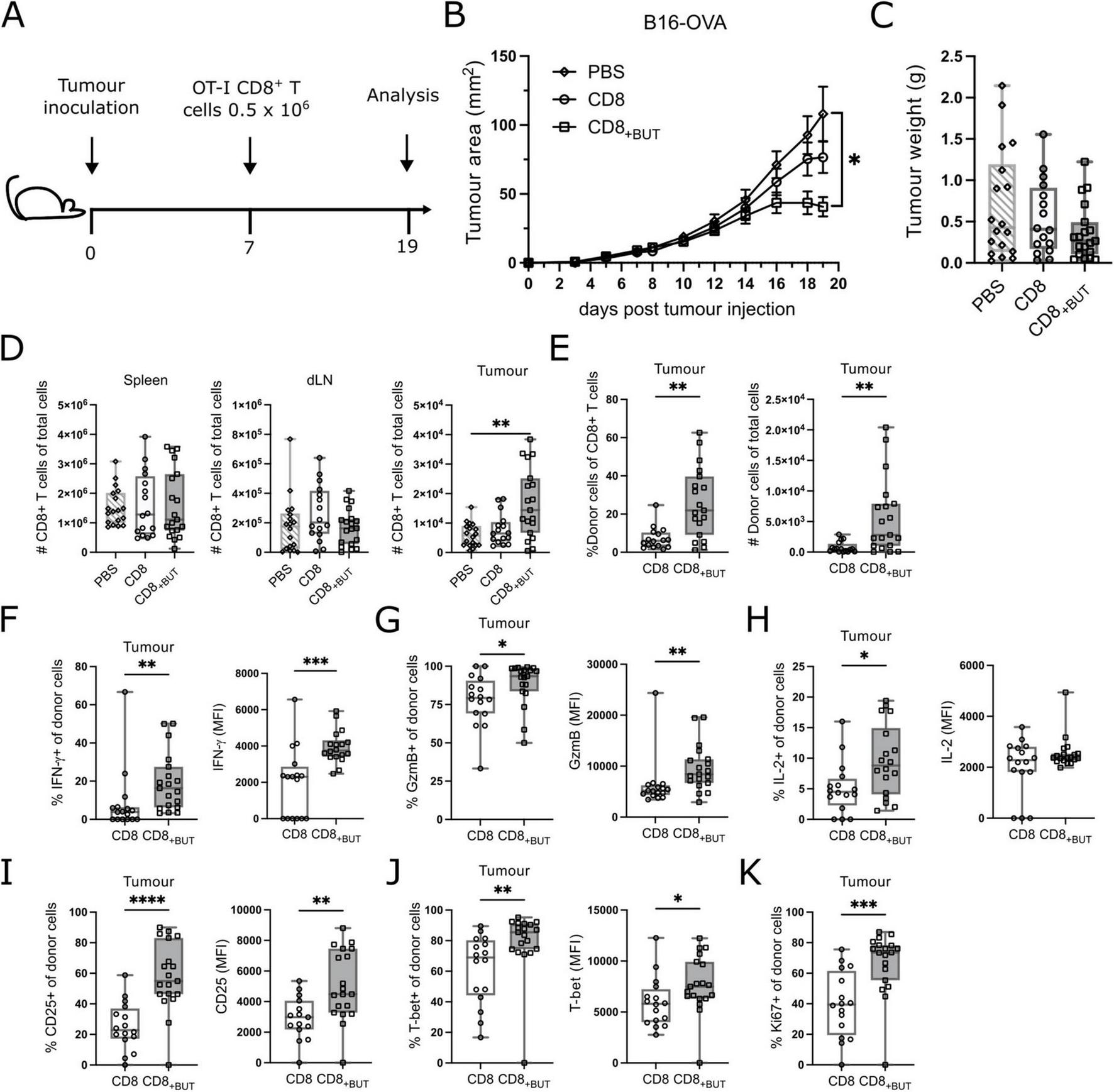 Butyrate-treated cells display enhanced in vivo tumor protection, effector function and proliferation. C57BL/6 Ptp mice received 2 × 105 B16-OVA cells s.c at day 0 then 5 × 105 OT-I CD8+ T cells in vitro activated ± butyrate i.v at day 7. At day 19 spleen, tumor and tumor draining lymph node were extracted and analyzed via flow cytometry. (A) Schematic for in vivo tumor experiments. (B) Tumor area (mm2) over time (days). (C) Tumor weights between treatments at day 19. (D) Total number of CD8+ T cells in the spleen, tumor draining lymph node and tumor. (E) Frequency and total number of donor CD45.2+CD8+ T cells within the tumor. (F) Frequency of IFN-γ+ donor cells and MFI of IFN-γ. (G) Frequency of GzmB+ donor cells and MFI of GzmB. (H) Frequency of IL-2+ donor cells and MFI of IL-2. (I) Frequency of CD25+ donor cells and MFI of CD25. (J) Frequency of T-bet+ donor cells and MFI of T-bet. (K) Frequency of Ki67+ donor cells. Data show box plots of three independent experiments. n = 15–19 mice per group, Kruskal–Wallis test with Dunn’s multiple comparisons test. *p ≤ 0.05 **p ≤ 0.01. ***p ≤ 0.001 ****p ≤ 0.0001. For (B), statistical analyses were performed on the tumor area at day 19.