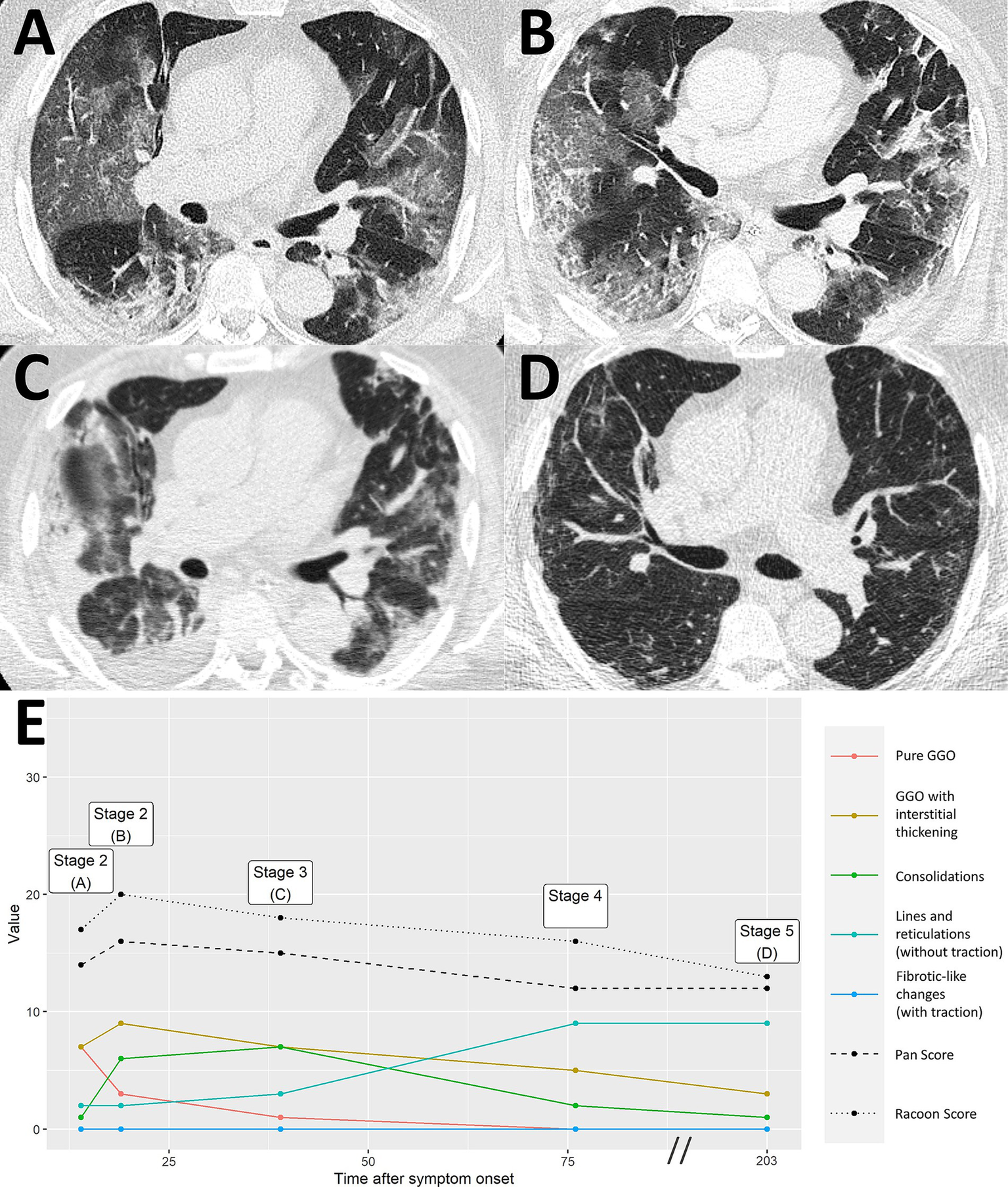 Severe COVID-19 pneumonia with residual imaging findings after >6 months follow-up. A 64-year-old male patient presented at the hospital 14 days after symptom onset, suffering from headaches and difficulty breathing. Chest CT demonstrated extensive ground glass opacities (GGO) with beginning interstitial thickening, consistent with progressive stage COVID-19 pneumonia [A, RVPS = 17 (7/7/1/2/0); stage 2]. Another chest CT 19 days after symptom onset reported an advance of the pneumonia to predominantly interstitial pathology and less ground glass [B, RVPS = 20 (3/9/6/2/0); stage 2]. Peak stage COVID-19 pneumonia with maximum consolidation was reached at 39 days after symptom onset [C, RVPS = 18 (1/7/7/3/0); stage 3]. Follow-up imaging on day 203 after symptom onset showed increasing linear opacities and fine parenchymal bands, yet no fibrotic-like changes with traction [D, RVPS = 13 (0/3/1/9/0); stage 5]. The subscores of the RVPS enable appreciation of such a typical time course of COVID-19 pneumonia, which is demonstrated in (E): Early and progressive stages are dominated by GGO and interstitial pathology (red/yellow), followed by a maximum of consolidation in peak stage (green), and eventually formation of linear opacities in resorption and post-COVID-19 stages (turquoise). RVPS, RACOON Viral Pneumonia Score; GGO, ground glass opacities.