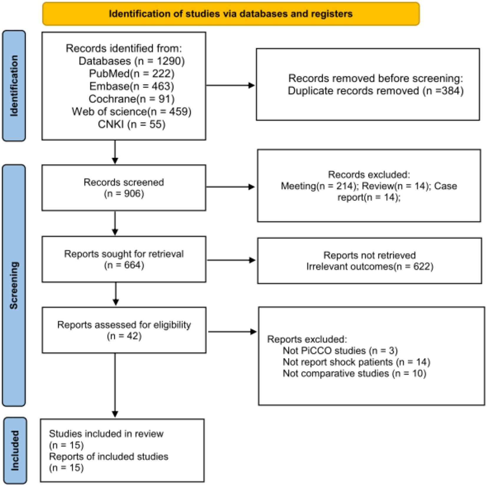 A literature search in various databases (Pubmed, Web of Science, Cochrane Library, Embase and China National Knowledge (CNKI)) was conducted on October 22nd, 2024 by using keywords such as “pulse index contour continuous cardiac output (PiCCO),” “traumatic shock,” and “hemorrhagic shock.” The detailed search strategy used for each database were listed in Supplementary Table S1.