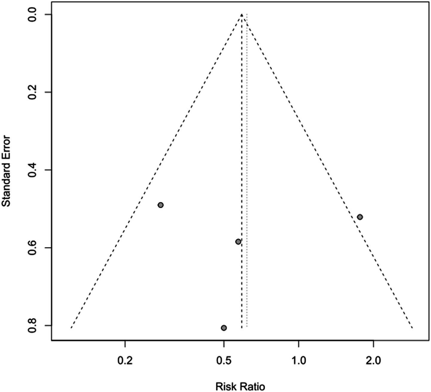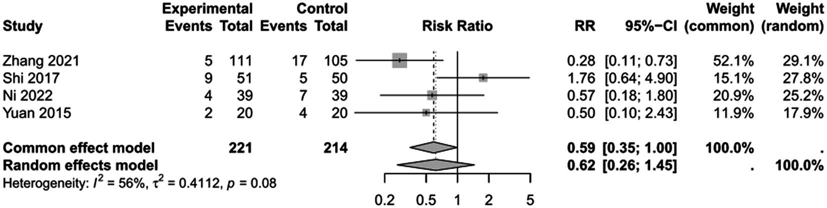 To assess the impact of PICCO monitoring on mortality of traumatic shock patients, 4 studies (9, 19, 25, 28) comprising 221 cases in PICCO group and 214 cases in control group were analyzed, including 2 RCTs, 1 prospective cohort study and 1 retrospective cohort study. As shown in the forest plot in Figure 2, although the risk of mortality in PICCO group was lower when compared with the control group, the difference between the two groups was not significant [RR in random effects model: 0.62; 95% CI: (0.26, 1.45)]. The I2 = 56% indicated moderate heterogeneity in the meta-analysis. The funnel plot was created to identify the publication bias. The symmetry of the plot indicated the meta-analysis did not exhibit significant publication bias (Figure 3). The result of the influence analysis demonstrated the robustness of the analysis (Figure 4).