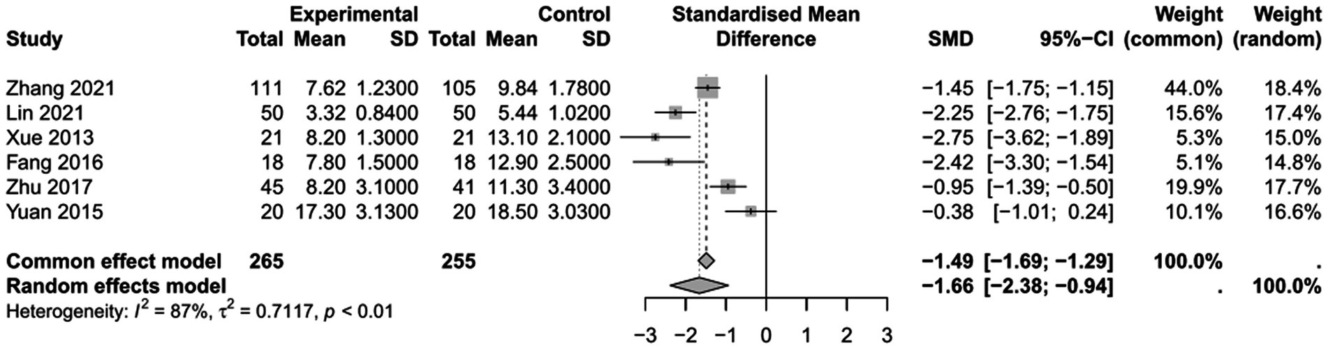 To assess the impact of PICCO monitoring on duration of mechanical ventilation of traumatic shock patients, 6 studies (9, 19, 25, 26, 29, 30) comprising 265 cases in PICCO group and 255 cases in control group were analyzed, including 2 RCTs and 4 retrospective cohort studies. The forest plot in Figure 5 showed that the duration of mechanical ventilation in PICCO group was significantly lower than that in control group [SMD in random effects model: −1.66; 95% CI: (−2.38, −0.94)]. The I2 = 87% indicated obvious heterogeneity in the meta-analysis. The symmetry of the funnel plot indicated no obvious publication bias in the meta-analysis (Figure 6). Finally, the robustness of the analysis was examined by sensitivity analysis, and exclusion of any study at one time did not materially alter the overall estimates (Figure 7).