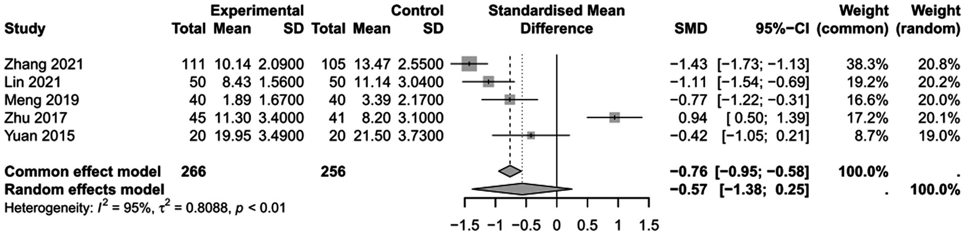 To assess the the impact of PICCO monitoring on length of ICU stay of traumatic shock patients, 5 studies (9, 25, 26, 29, 31)comprising 266 cases in PICCO group and 256 cases in control group were analyzed, including 3 RCTs and 2 retrospective cohort studies. As shown in the forest plot, treatment based on PICCO displayed beneficial effect when compared with the control group, but the difference between the two groups was not significant [SMD in random effects model: −0.57; 95% CI: (−1.38, 0.25)]. To enhance interpretability, the SMD value was translated into clinical units: based on the pooled standard deviation of ICU stay (approximately 2.3 days across studies), this corresponds to an average reduction of about 1.3 days in ICU stay for the PICCO group compared to the control group. The I2 = 95% indicated significant heterogeneity in the meta-analysis (Figure 8). The funnel plot in Figure 9 demonstrated a moderate publication bias in the meta-analysis. The sensitivity analysis further demonstrated the robustness of the meta-analysis results, confirming that the overall conclusions were not significantly affected by the exclusion of individual studies (Figure 10).