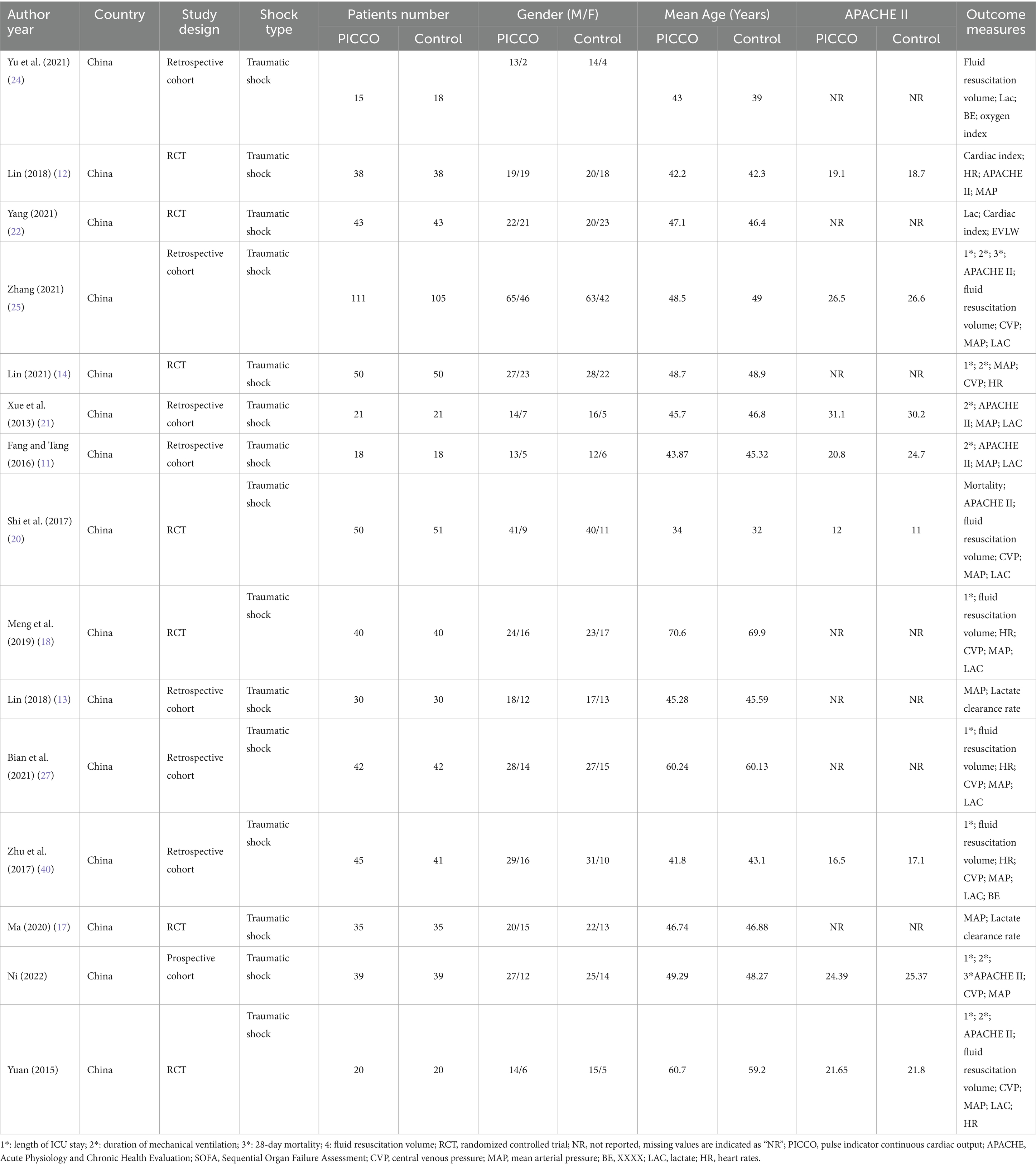 Methods: A systematic literature retrieval was conducted in databases including PubMed, Web of Science, Cochrane Library, Embase, and China National Knowledge Infrastructure (CNKI) from database inception to October 22, 2024. Keywords such as “PICCO,” “traumatic shock,” and “hemorrhagic shock” were used. Retrieved studies were screened according to pre-determined inclusion and exclusion criteria. The methodological quality and risk of bias were assessed using the Newcastle-Ottawa Scale (NOS) for cohort studies and the Cochrane “risk of bias” tool for randomized controlled trials (RCTs). Outcomes, including mortality, duration of mechanical ventilation, and length of ICU stay, were extracted and meta-analyzed.