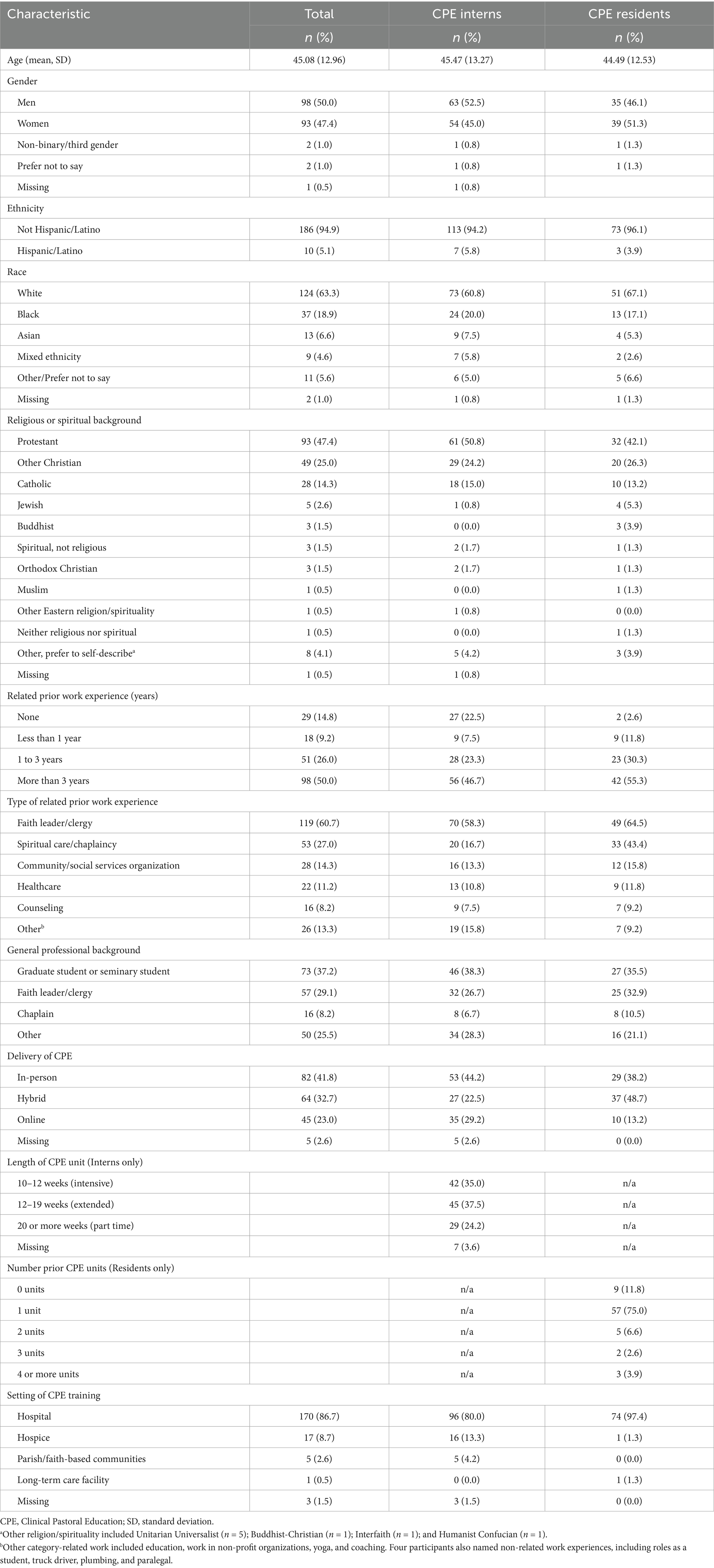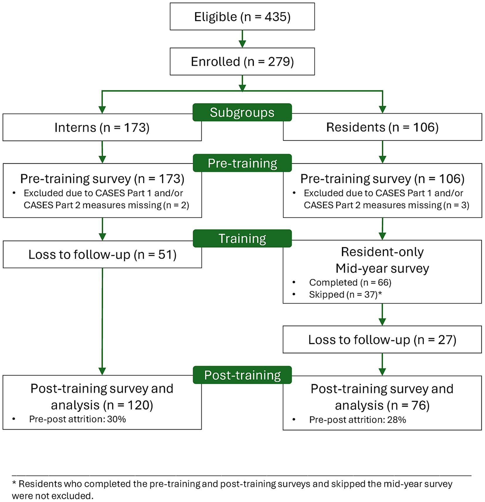 A total of 279 individuals submitted the baseline survey, consisting of 173 (62%) first-unit CPE interns and 106 (38%) CPE residents. Participating CPE programs reported 435 eligible CPE students in their respective CPE programs, which yielded a 64% baseline response rate. The post-training surveys were completed by 196 participants, 72% of those at baseline. The attrition consisted of students who did not complete the post-training survey or completed it only partially and students who withdrew from their respective CPE training and thus became ineligible. Figure 1 presents the flow of participants and attrition throughout the study. Our analysis focused on 196 respondents with matched pre-post data, including 120 (61%) first-unit CPE interns and 76 (39%) CPE residents. These participants were enrolled in CPE at 29 ACPE-accredited centers in 15 states of the United States, with all four U. S. census regions represented (i.e., Northeast, Midwest, South, and West). The 29 centers represented 9.6% of the 303 ACPE-accredited centers in 2020 in the United States (60).