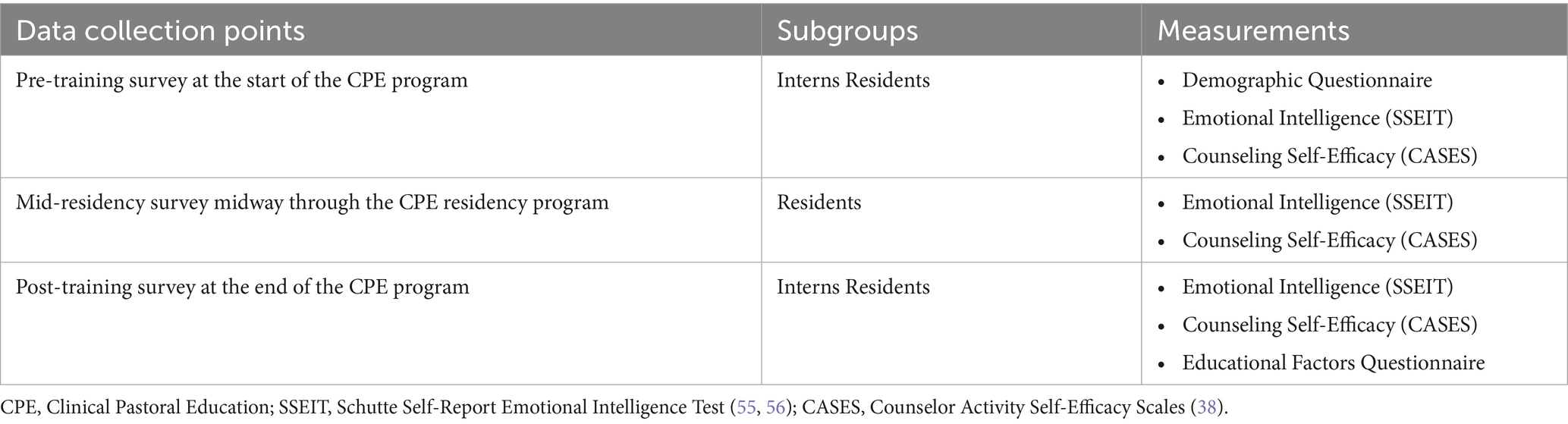 More recently, Jankowski et al. (20) found increases in EI, self-reflection, and pastoral skills over a single CPE unit in one CPE center. In a recent qualitative study, graduates of CPE reported lasting effects of CPE in areas including self-awareness, emotional intelligence, personal growth, and other awareness, as well as in communication, listening, interventions, and assessment skills (21). A pre-post mixed methods study found that CPE students developed their EI, counseling self-efficacy (CSE), and listening and attending skills during a CPE unit (14). Overall, the weaknesses in existing CPE research include small sample sizes drawn from one or only a limited number of CPE programs, predominantly cross-sectional designs, and participants recruited from the researchers’ own students and programs, increasing the risk of bias (19). More pretest-posttest multicenter studies with larger samples that investigate measurable outcomes with standardized instruments are needed.