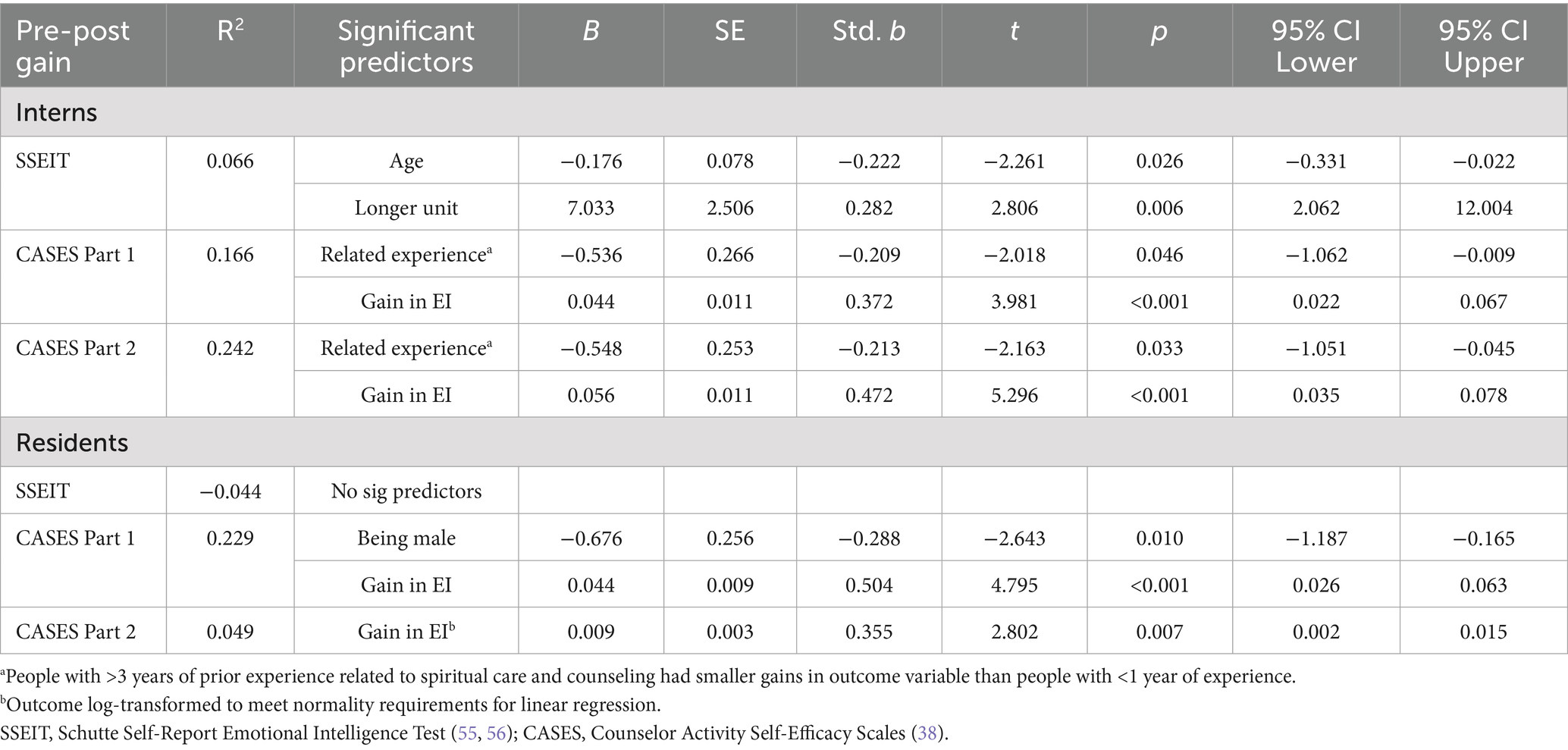 Linear regression was used to identify significant predictors of pre-to-post change over the course of a CPE internship or residency program for three outcome measures: SSEIT, CASES Part 1: Helping Skills Self-Efficacy, and CASES Part 2: Session Management Self-Efficacy scale. Covariates in the regression included available demographics (age and gender) as well as theory-based variables, including years of relevant spiritual care or counseling experience prior to CPE; length of the program (for interns only, 20 weeks or more for a part-time unit compared to a shorter-duration intensive or extended unit); and method of program delivery (in-person, on-line, or hybrid). Because EI theoretically precedes CSE, the pre-to-post CPE change in SSEIT was added as a covariate to the CASES Part 1 and Part 2 regressions. Ethnicity, religion, and education were not included due to insufficient participants in subcategories and to keep the regression model parsimonious. To confirm the appropriateness of linear regression, the normality of the dependent variables was evaluated using the Shapiro–Wilk test. Pre-to-post CASES Part 2 gain among residents was the only non-normally distributed outcome; therefore, the outcome was Log10 transformed before performing the regression. After transformation, regression residuals were confirmed to be normally distributed, confirming the applicability of linear regression. Post-hoc comparisons of baseline levels were conducted for predictors and outcomes of interest identified in the regressions.
