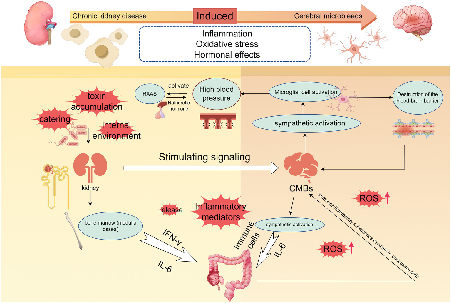 The microscopic mechanisms of chronic kidney disease-induced cerebral microbleeds are locally relevant. The development of hypertension is accompanied by the development of chronic kidney disease, and when dietary, environmental, or other stimulus signals such as accumulation of uremic toxins are transmitted to the brain to activate the sympathetic nerves, the persistent activation of microglia and neuroinflammation occurring promotes the development of hypertension, and disruption of the blood–brain barrier. Elevated blood pressure also activates the RAAS system, and hyperperfusion promotes cerebrovascular damage. Immune cells are released into the gut and kidneys, destroying gut flora and PH, and immune substances end up in the renal circulation. When vitamin D deficiency, oxidative stress will further promote the release of inflammatory factors, part of the inflammatory response can also be achieved through the NF-κB signaling pathway, a large number of inflammatory factors to promote increased permeability of the brain barrier, damage to the vascular endothelium, accelerated the formation of CMBs (By Figdraw.).