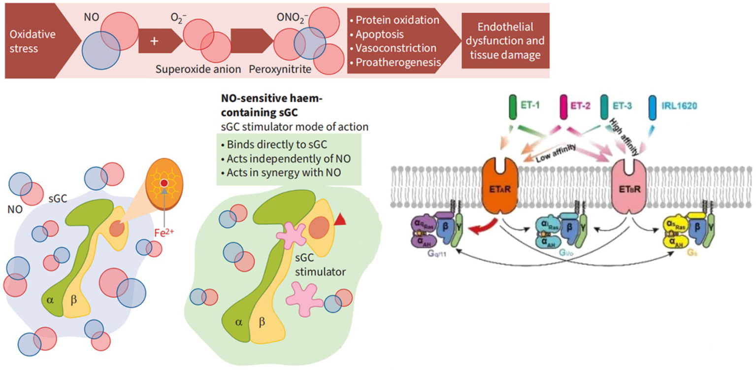 The mechanism of action of soluble guanylate cyclase (sGC) stimulants and activators. α, SGC α subunit; β value, sGC β subunit; cGMP, Cyclic guanosine monophosphate; Fe2+, Iron ions oxidize in a + 2 state; NO, Nitric oxide; O2-, Superoxide anion; ONO2-, Peroxynitrite.