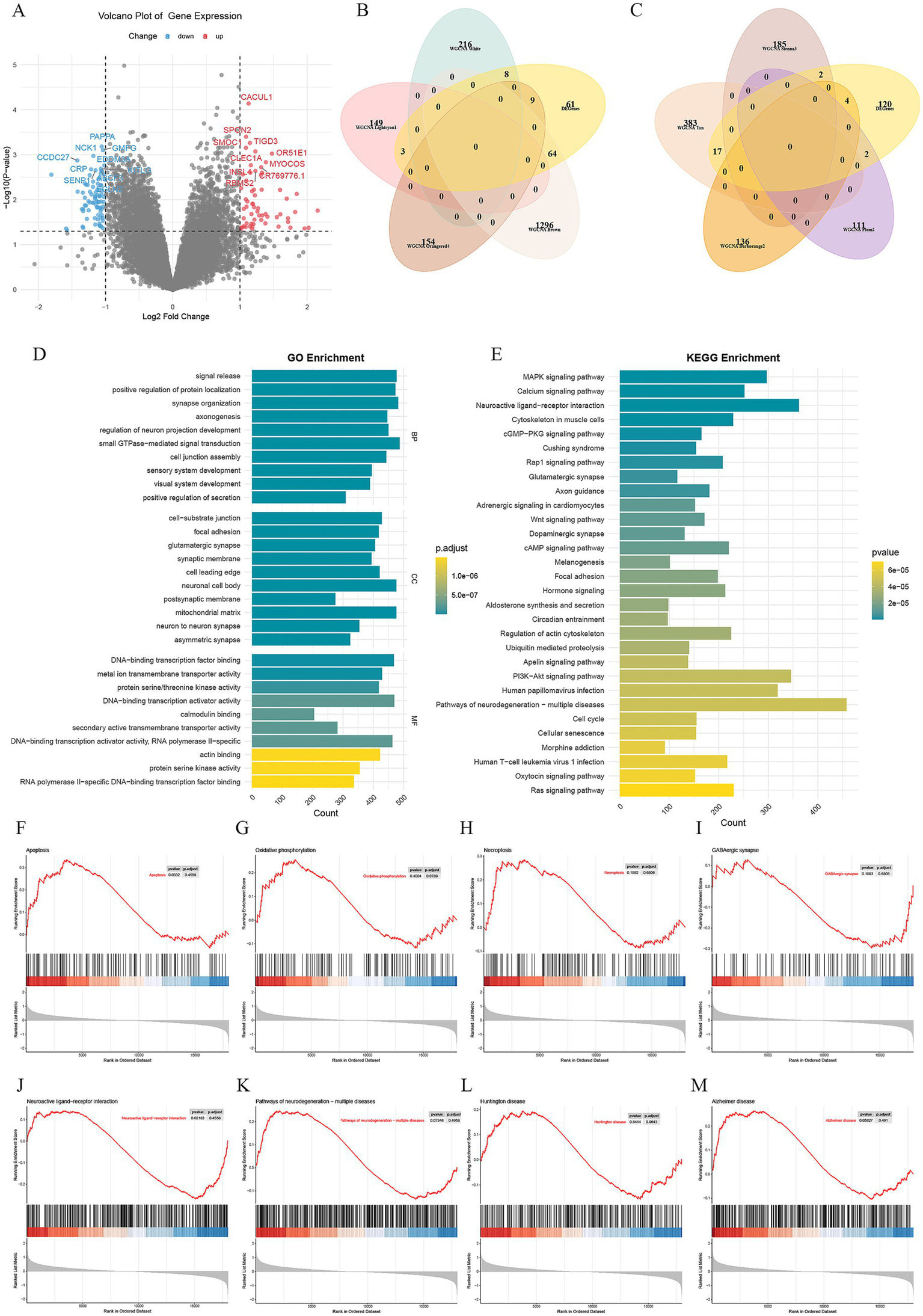Differential expression analysis and functional enrichment analysis. (A) Volcano plot of differential analysis, where red represents upregulation and blue represents downregulation. (B) Modules with |r| ≥ 0.8 overlapped with DEGs. (C) Modules with |r| ≥ 0.7 overlapped with DEGs. (D) GO enrichment analysis. (E) KEGG enrichment analysis. (F–M) GSEA enrichment analysis.