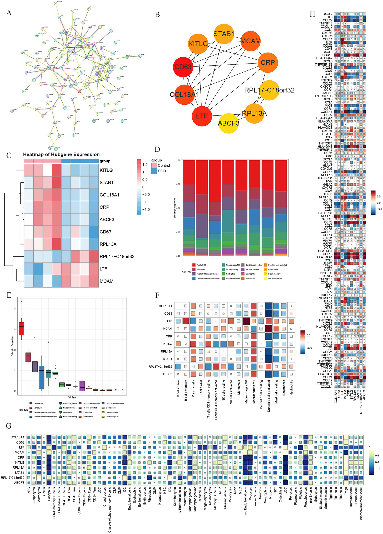 The immune infiltration analysis of the samples using XCELL showed a significant correlation between the top 10 genes and the XCELL results. The following cell types were closely related: Astrocytes, Basophils, CD4 + Tcm, CD4 + Tem, CD8 + Tcm, CD8 + Tem, Chondrocytes, Dendritic cells (DC), Endothelial cells, immature Dendritic cells (iDC), lymphatic Endothelial cells (ly Endothelial cells), Macrophages M2, microvascular Endothelial cells (mv Endothelial cells), Myocytes, Neutrophils, plasmacytoid Dendritic cells (pDC), Platelets, Preadipocytes, pro B-cells, and Tregs. RPL17-C18orf32, LTF, and MCAM showed a positive correlation with Astrocytes, Basophils, CD8 + Tem, Chondrocytes, DC, iDC, mv Endothelial cells, Myocytes, Neutrophils, pDC, Preadipocytes, and a negative correlation with CD8 + Tcm, Endothelial cells, ly Endothelial cells, Platelets, and Tregs. COL18A1, CD63, CRP, KITLG, RPL13A, STAB1, and ABCF3 exhibited a negative correlation with Astrocytes, Basophils, CD8 + Tem, Chondrocytes, DC, iDC, mv Endothelial cells, Myocytes, Neutrophils, pDC, Preadipocytes, and a positive correlation with CD8 + Tcm, Endothelial cells, ly Endothelial cells, Platelets, and Tregs (Figure 3G).